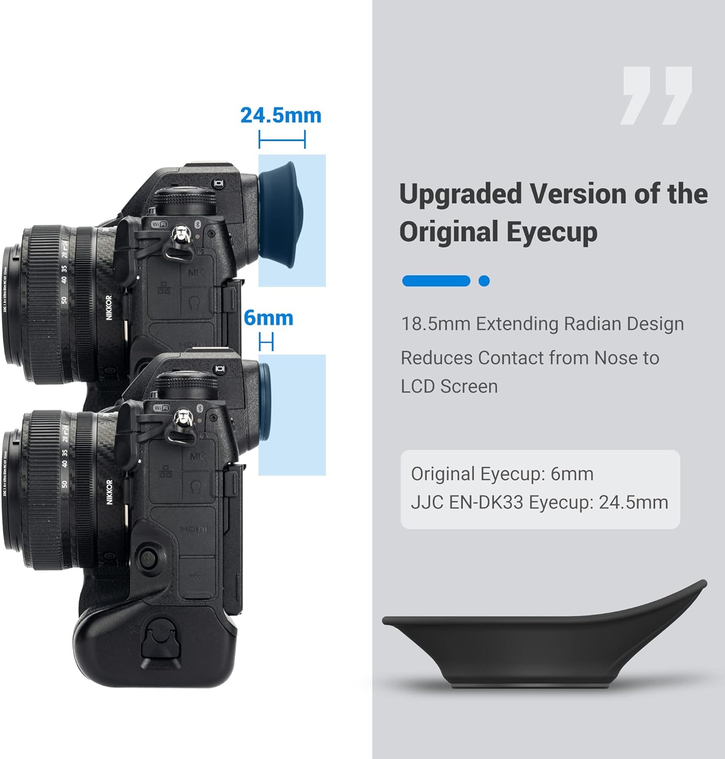 - Aktualisierte Version: Die JJC-Augenmuschel ist 18,5 mm tiefer als die ursprüngliche Augenmuschel, wodurch die Optik des Suchers verbessert und der Kontakt von der Nase zum LCD-Bildschirm verringert wird. Verglichen mit der Augenmuschel JJC EN-DK33 hat