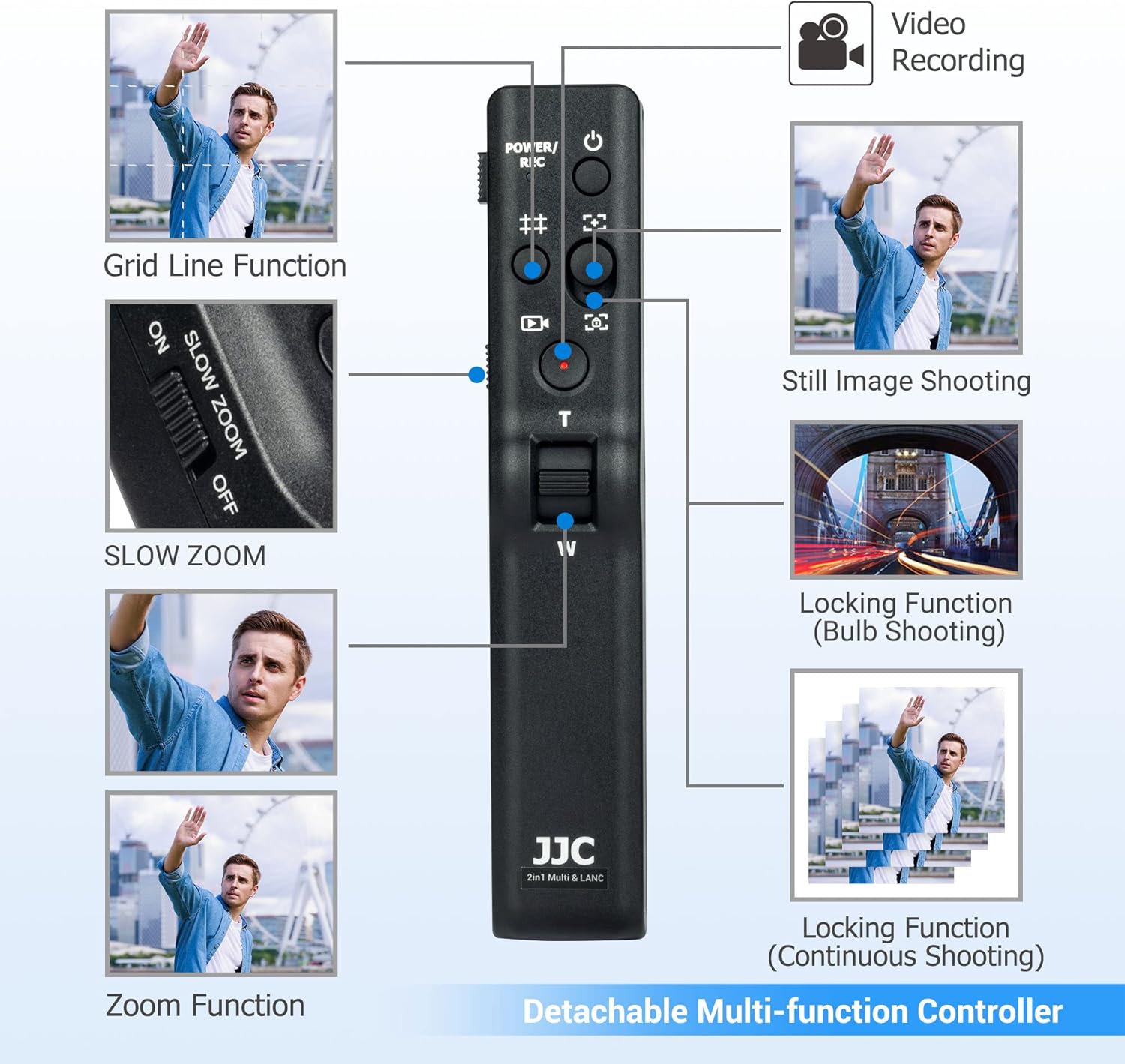 - VERFÜGBARE FUNKTIONEN - Dieser abnehmbare kabelgebundene Fernbedienung verfügt über Ein-/Ausschalten, Video-/Standbildaufnahme, Zoomen, langsames Zoomen, Sperrfunktion und Anzeige von Gitterlinien. (Hinweis: Nicht alle Kameras/Camcorder unterstützen