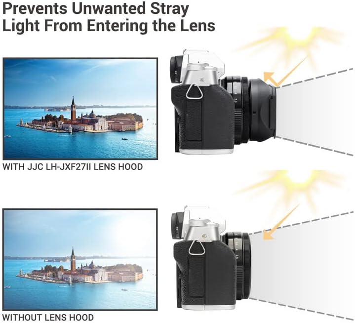- Blockiert Streulicht: Die Gegenlichtblende von JJC verhindert das Eindringen von unerwünschtem Streulicht in das Objektiv, indem sie das Ende des Objektivs verlängert und abschirmt.