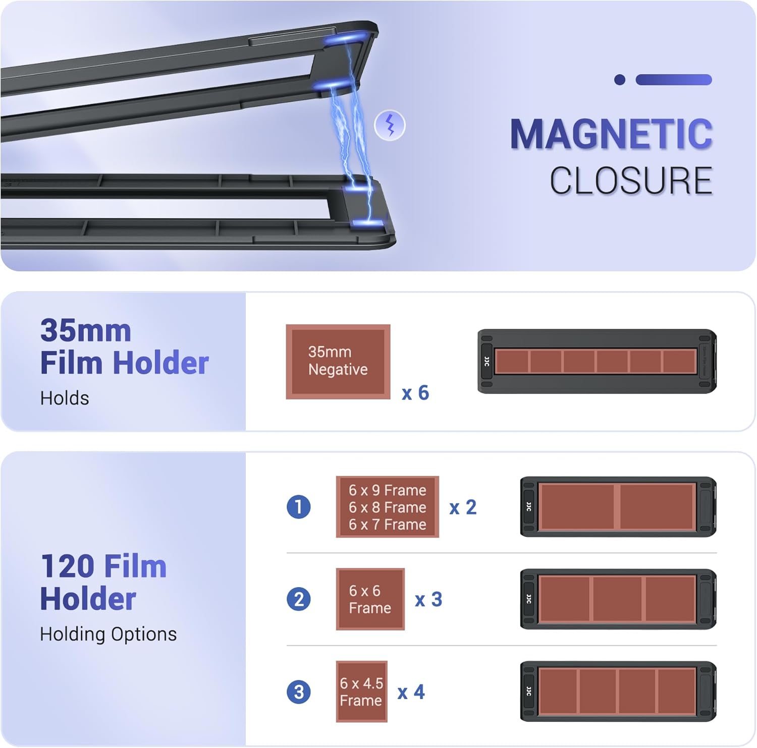 - 35 mm und 120 Filmhalter: Die Halterung verfügt über eine transparente Maske, die den Film erheblich abflachen und die Bildklarheit verbessern kann. Magnetverschluss ermöglicht einfaches Öffnen und Schliessen. Die Halterungen unterstützen auch das