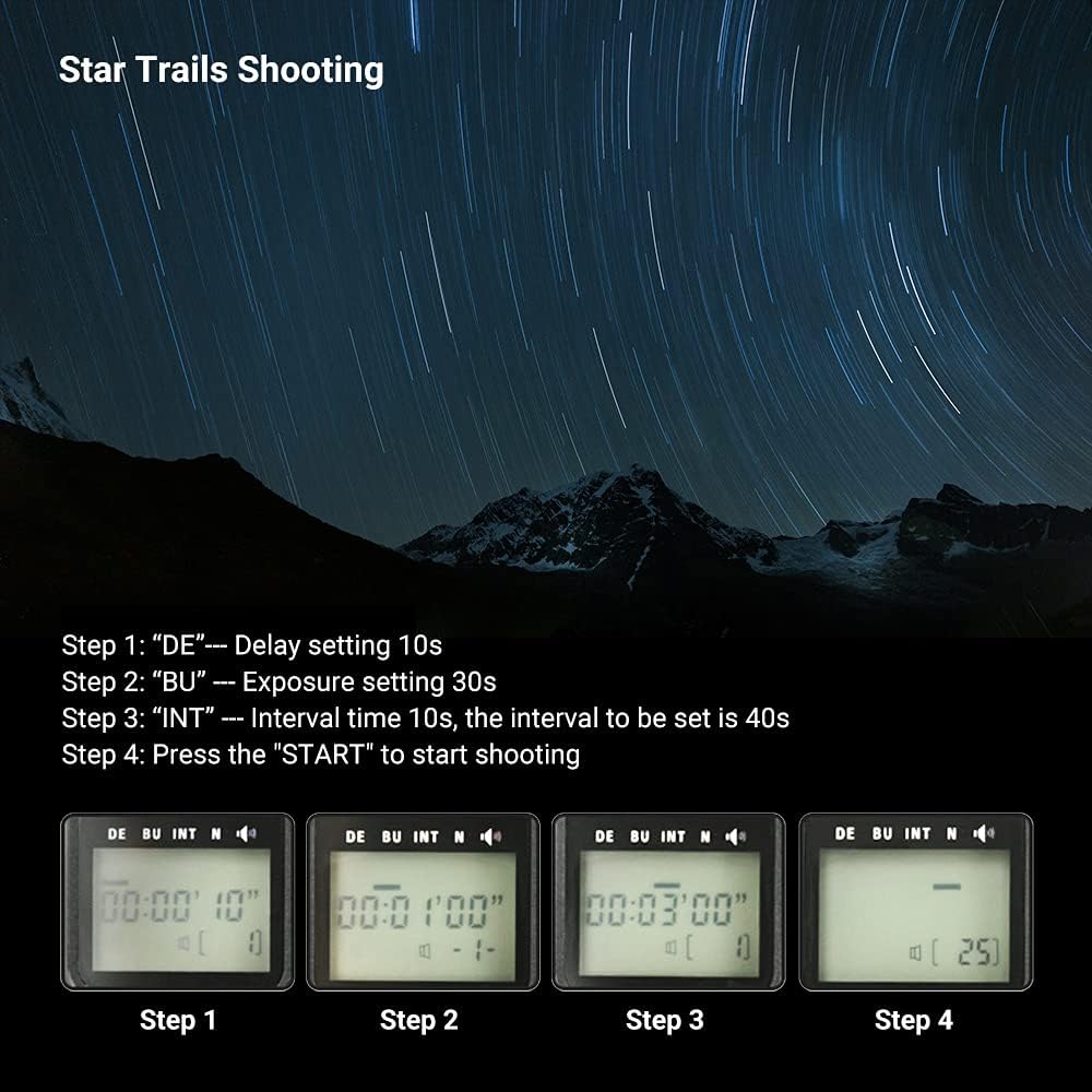 • 【Mehrere Timer-Modi】Ausgestattet für eine lange Liste von Timer-Funktionen: Selbstauslöser, Langzeitbelichtungstimer, Intervall-Timer, Steuerung der Anzahl der Aufnahmen sowie Multi-Belichtungs-Timer.