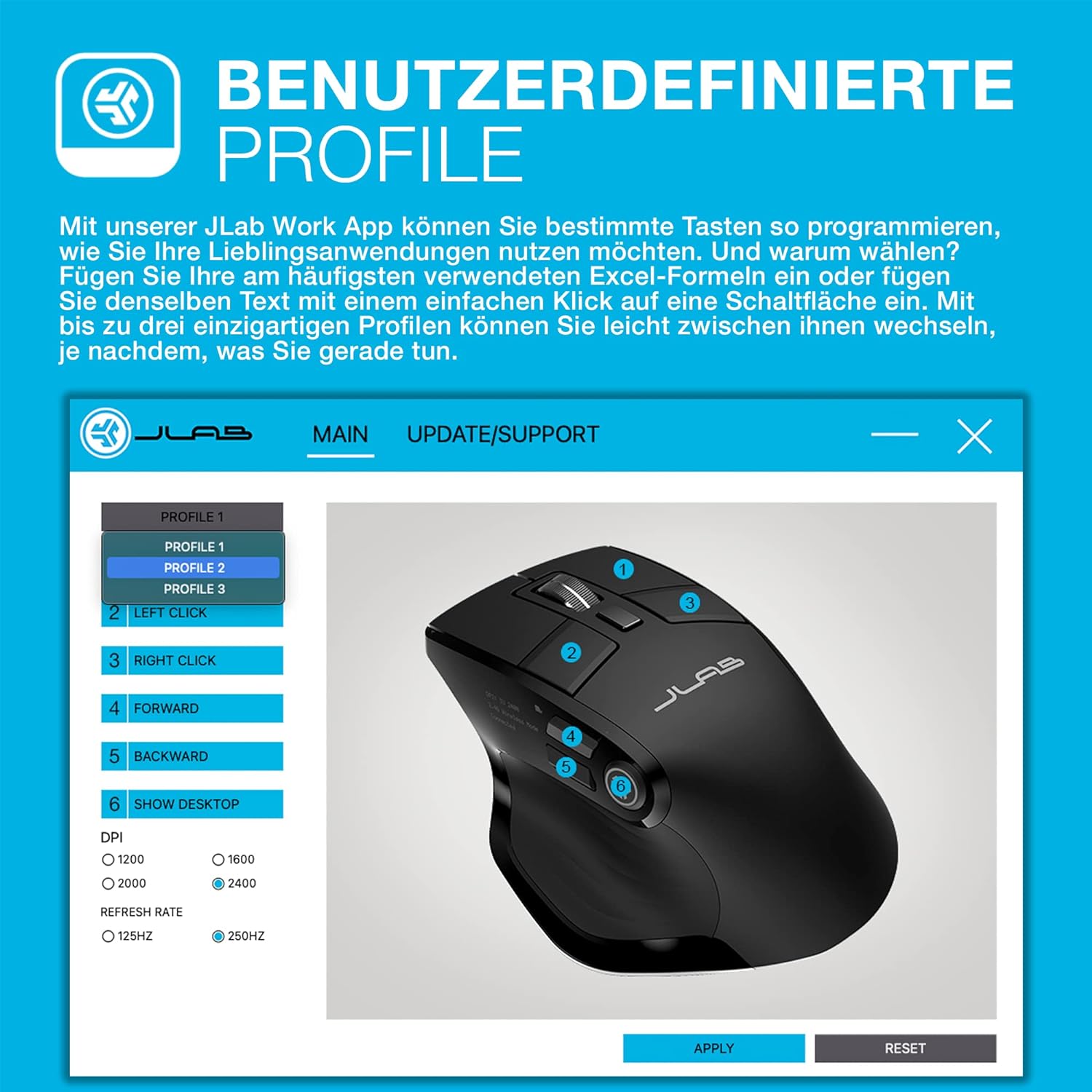 - INDIVIDUELLE BENUTZERPROFILE: Mit der JLab Work App können Sie bestimmte Schaltflächen so programmieren, wie Sie Ihre Lieblingsanwendungen verwenden. Fügen Sie Ihre am häufigsten verwendeten Formeln ein oder fügen Sie denselben Text mit einem