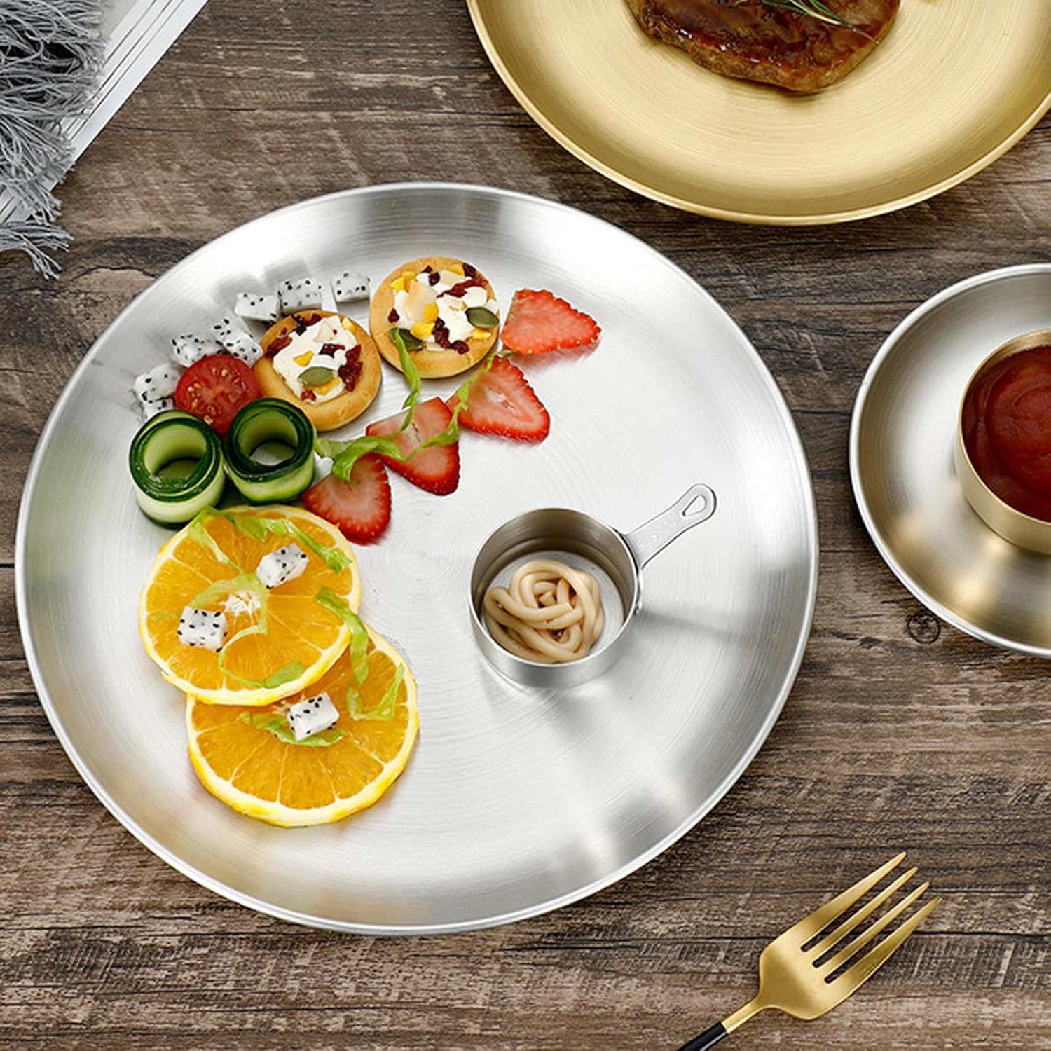 - Langlebiges Material: runder flacher Teller aus Edelstahl 304, BPA-frei, Stahlplatte ist leicht und langlebig, einfach zu benutzen und zu reinigen, rund, ohne keine scharfen Kanten.