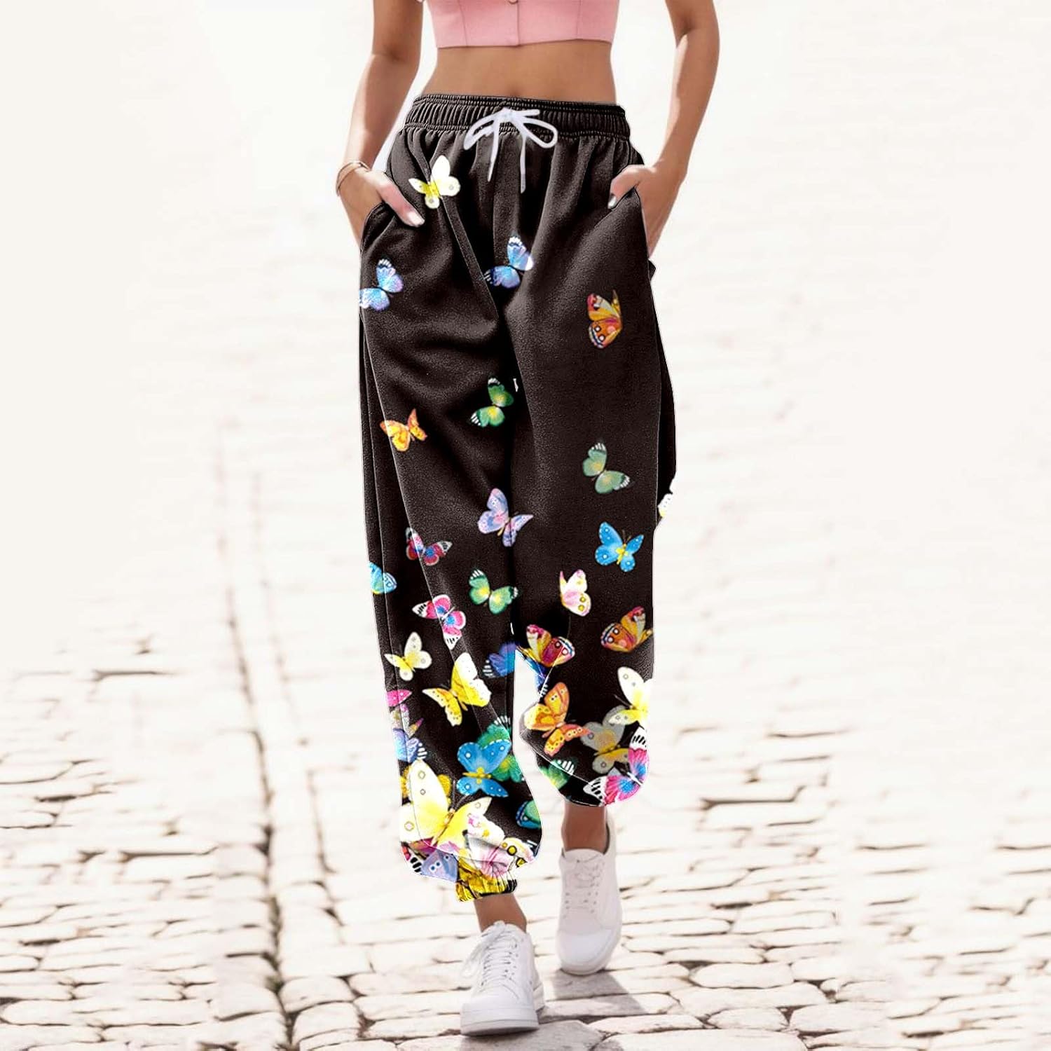 Jogginghose Damen, Damen Jogginghose Lang High Waist Trainingshose mit Taschen Schmetterling Drucken