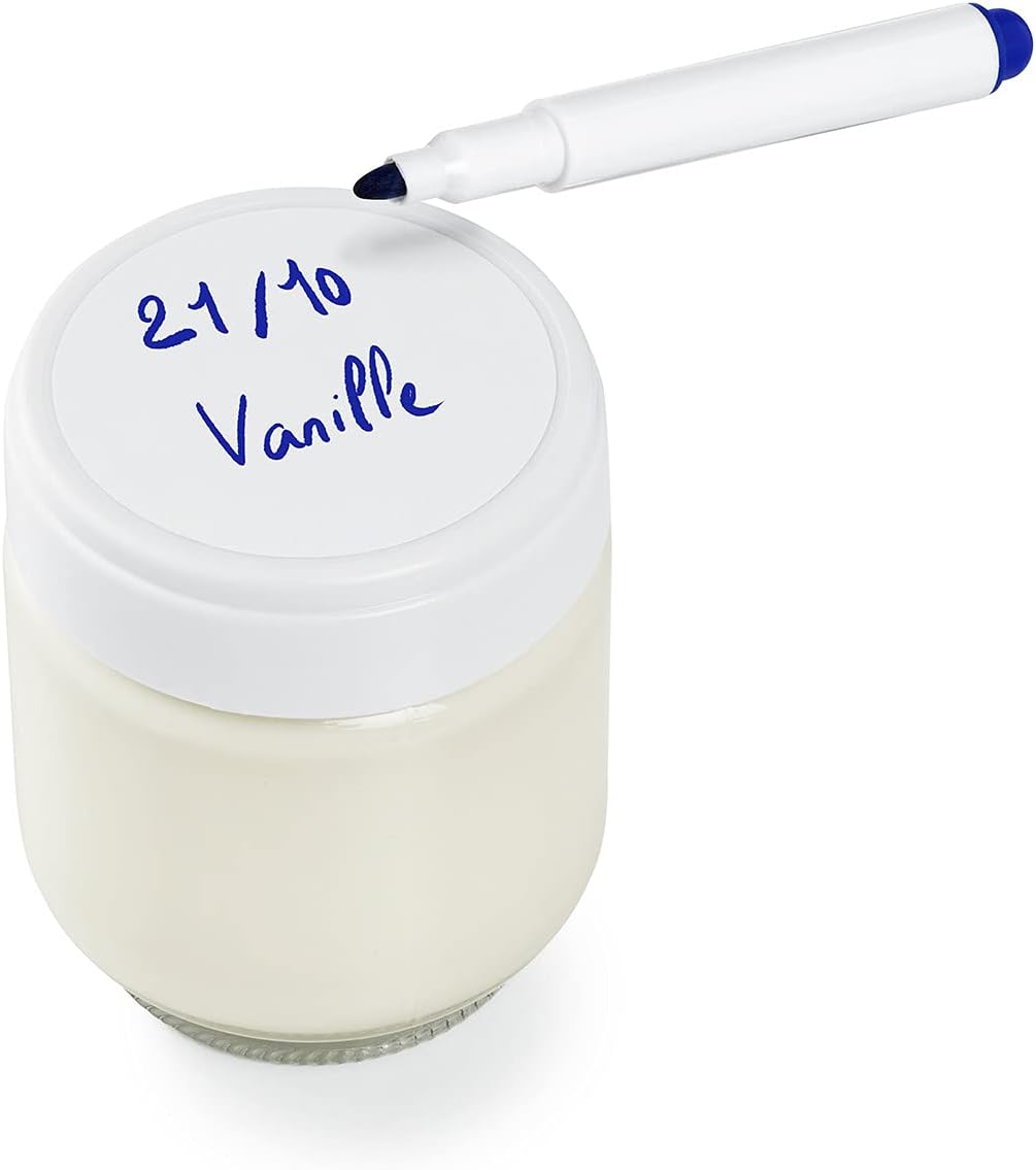 • Die Deckel der Gläser verfügen über eine Markierungszone, die mit dem mitgelieferten abwischbaren Stift beschriftet werden kann: das Datum des Joghurts, seinen Duft