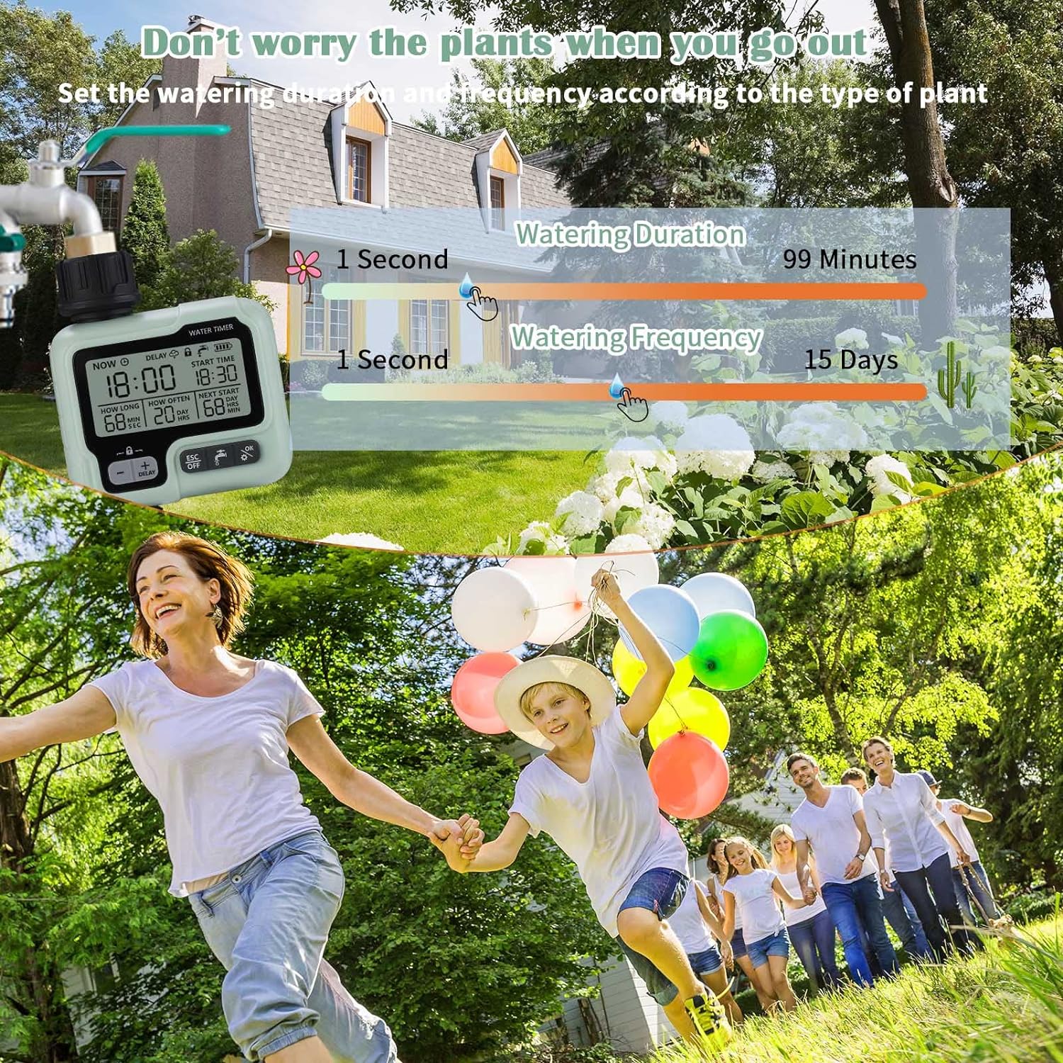 - Flexible Bewässerungseinstellungen -- Die Bewässerungszeit reicht von 1 Sekunde bis 99 Minuten mit Frequenzen von 1 Stunde bis 15 Tagen.