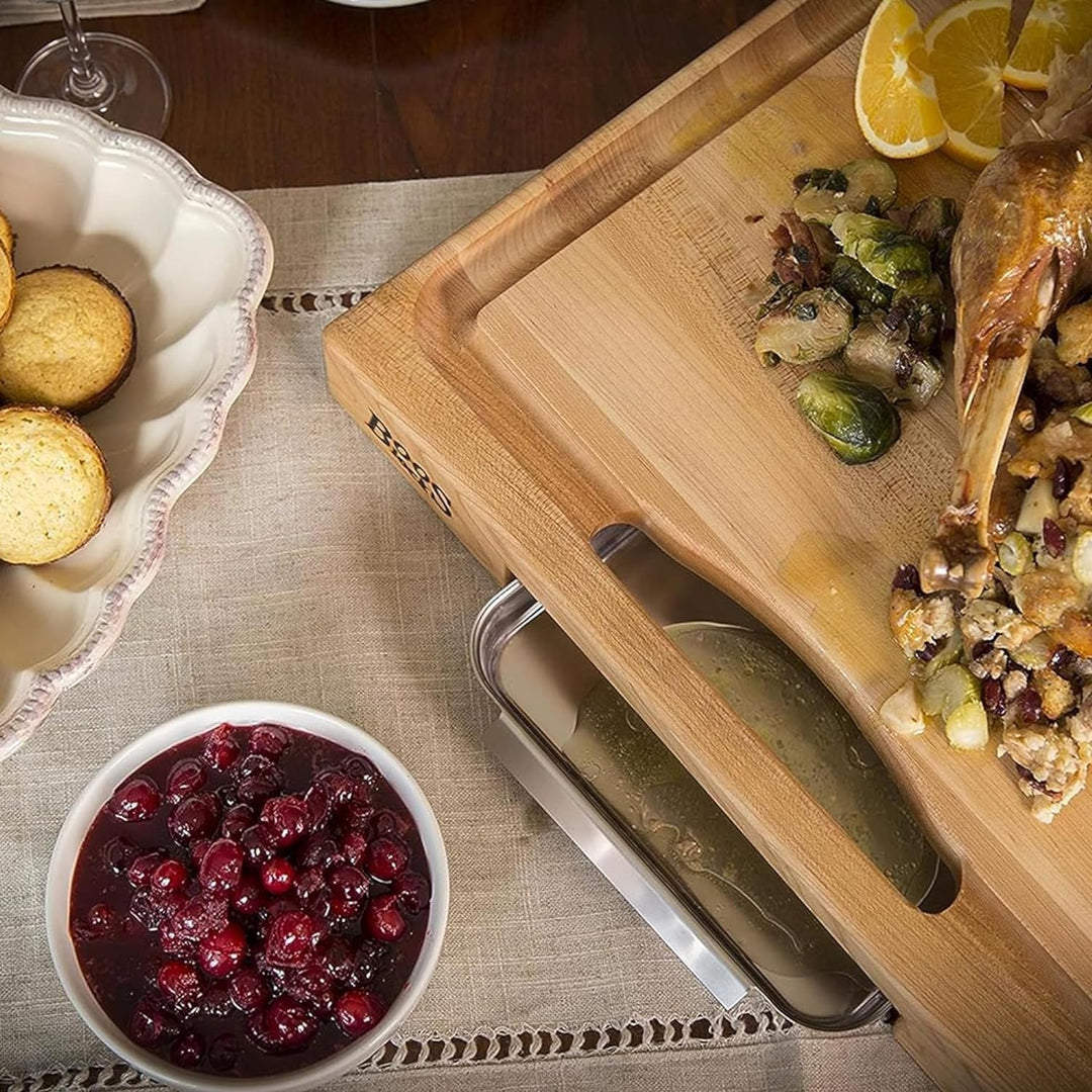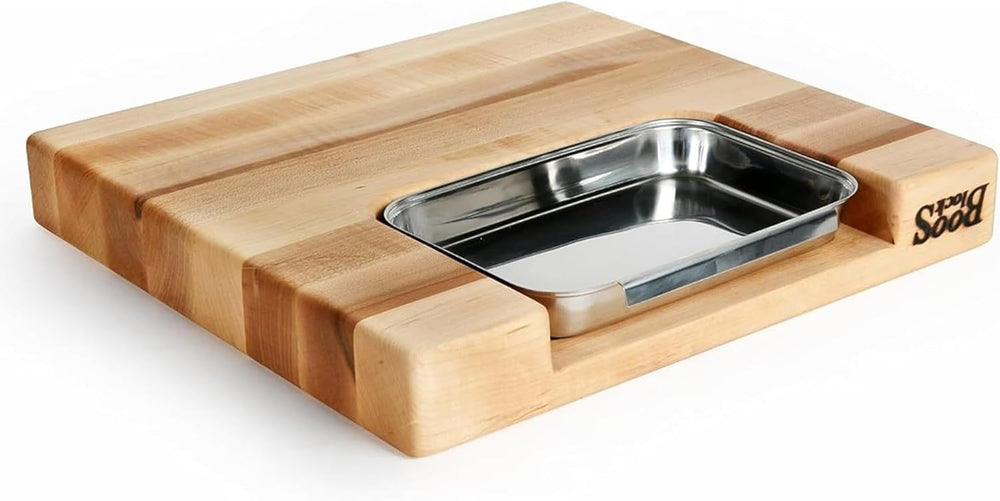 - Reversible: This versatile board features two cutting surfaces. The top side features an integrated sloped juice well, and the reverse side is a completely flat cutting surface. A stainless steel juice pan works with both side of the cutting board