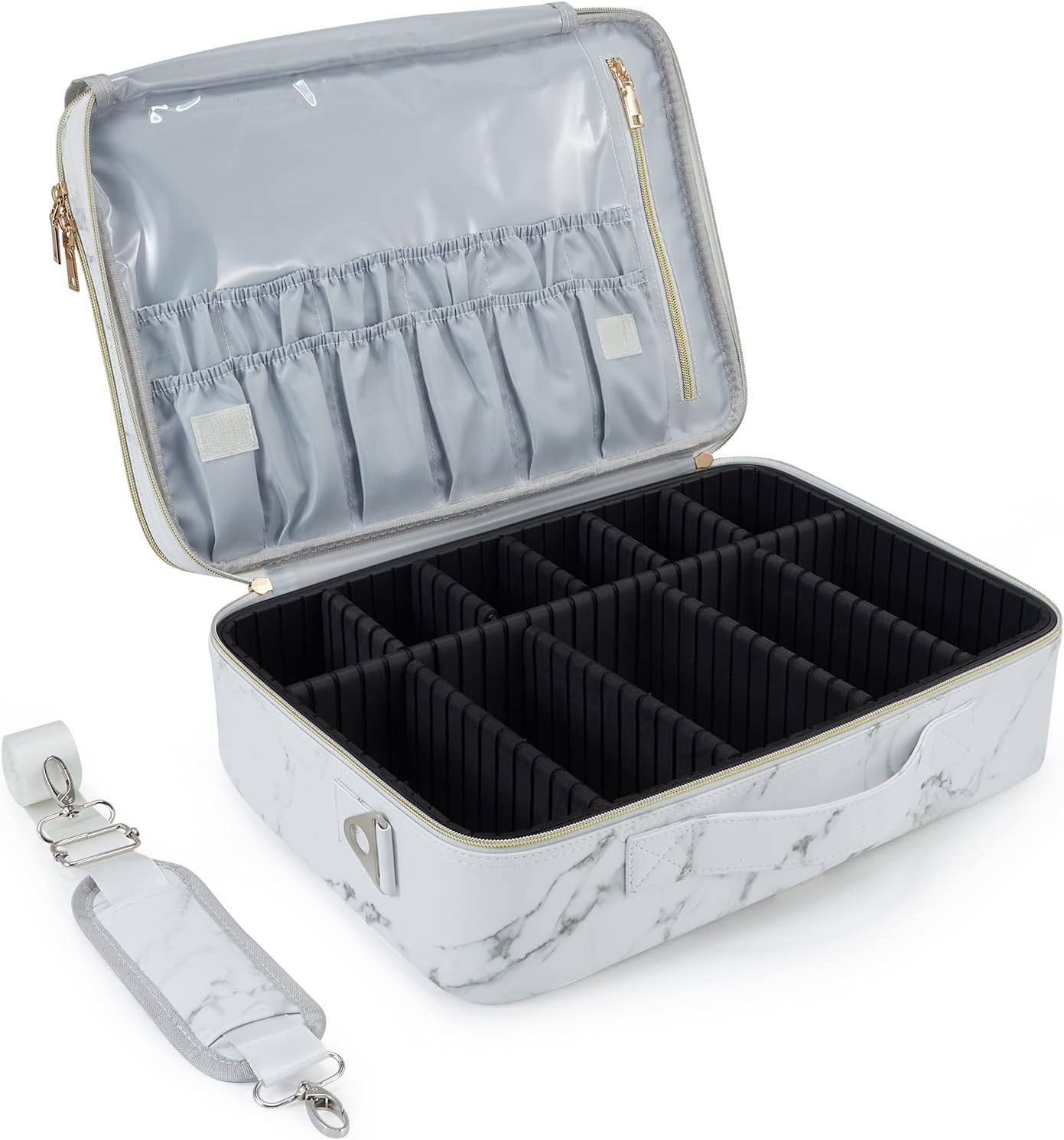 - Besten Aufteilung : Sie können durch Trennwände das Hauptfach unterteilen , damit Sie Ihre Kosmetika sortieren können . Sie können nach Ihrem Bedarf regeln , ob Sie diese Trennwände benutzen . Wenn Sie das Hauptfach nicht unterteilen , wird es ein