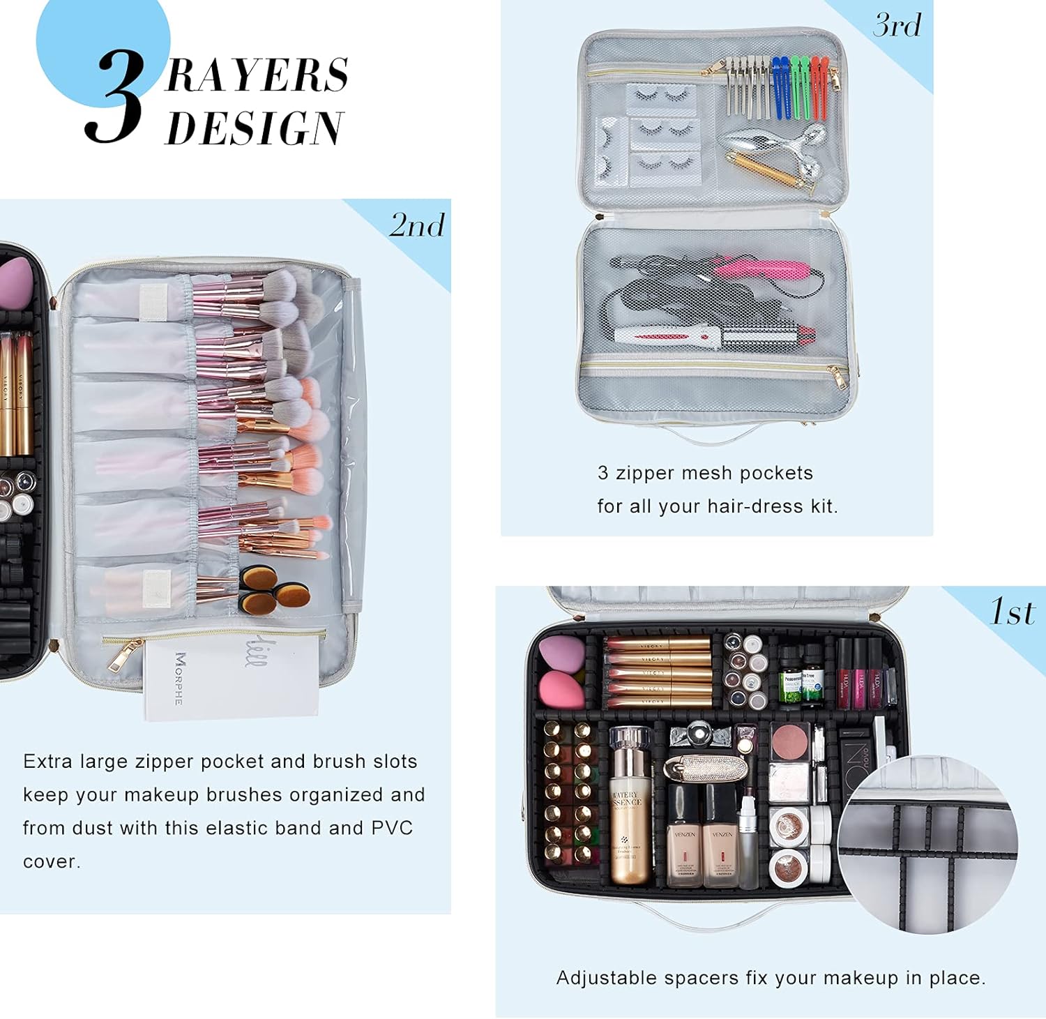 - Kapazität der Kosmetiktasche : diese Kosmetiktasche verfügt über 2 Reissverschlussfach . Im unteren Fach gibt es grosse Hauptfach mit verstellbaren Trennwände und Steckplätze für Make-up-Pinsel . Im oberem Fach hat diese Kosmetiktasche 2 Netztasche