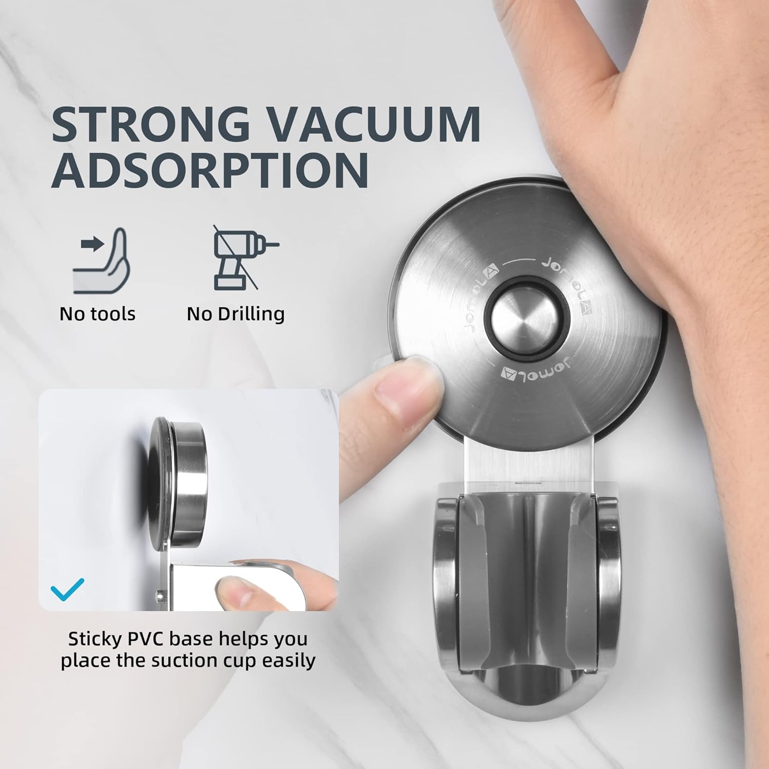 - 【Extra starke Saugnapf und Edelstahlmaterial】- JOMOLA Saugnapf-Duschkopfhalter arbeitet nach Vakuumadsorptionsprinzip. Der Saugnapf hat einen Durchmesser von 6,5 cm, was sich durch überlegene Flexibilität und gute Luftdichtheit auszeichnet.