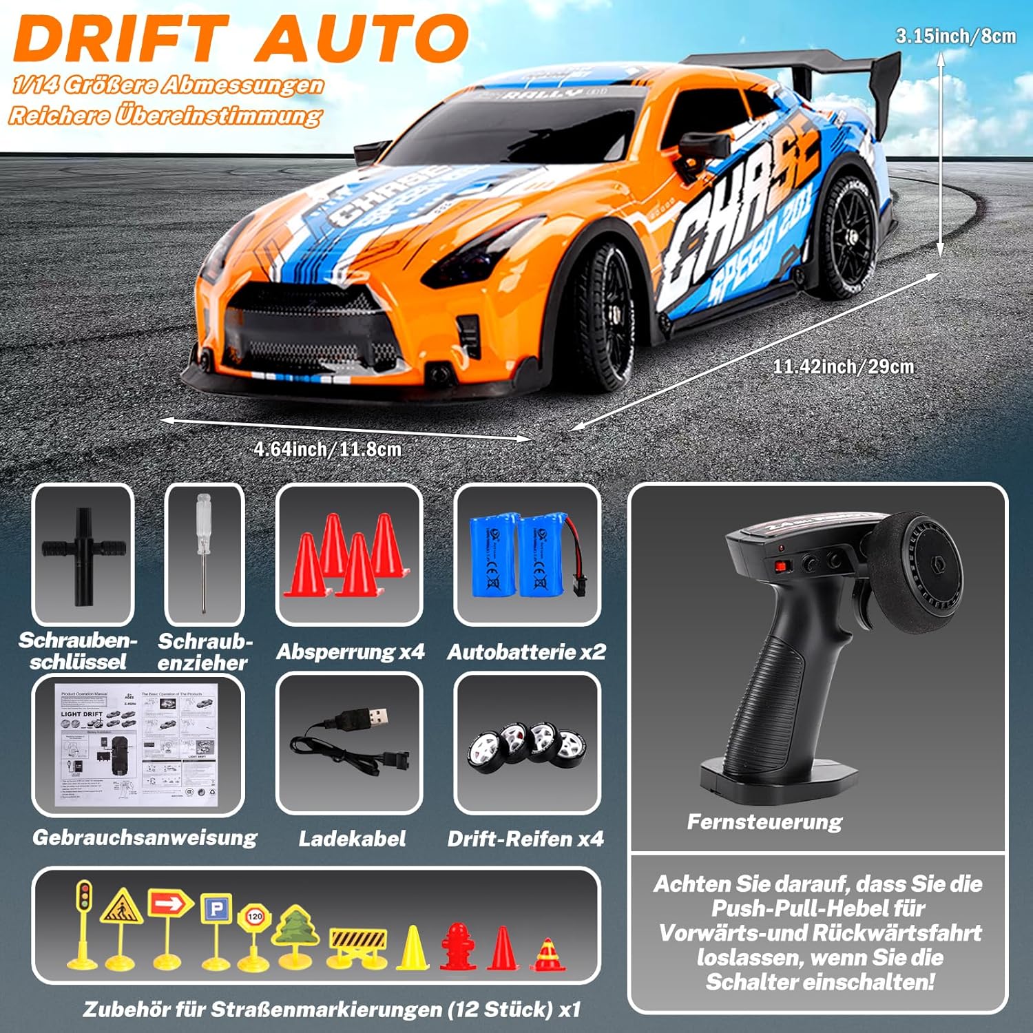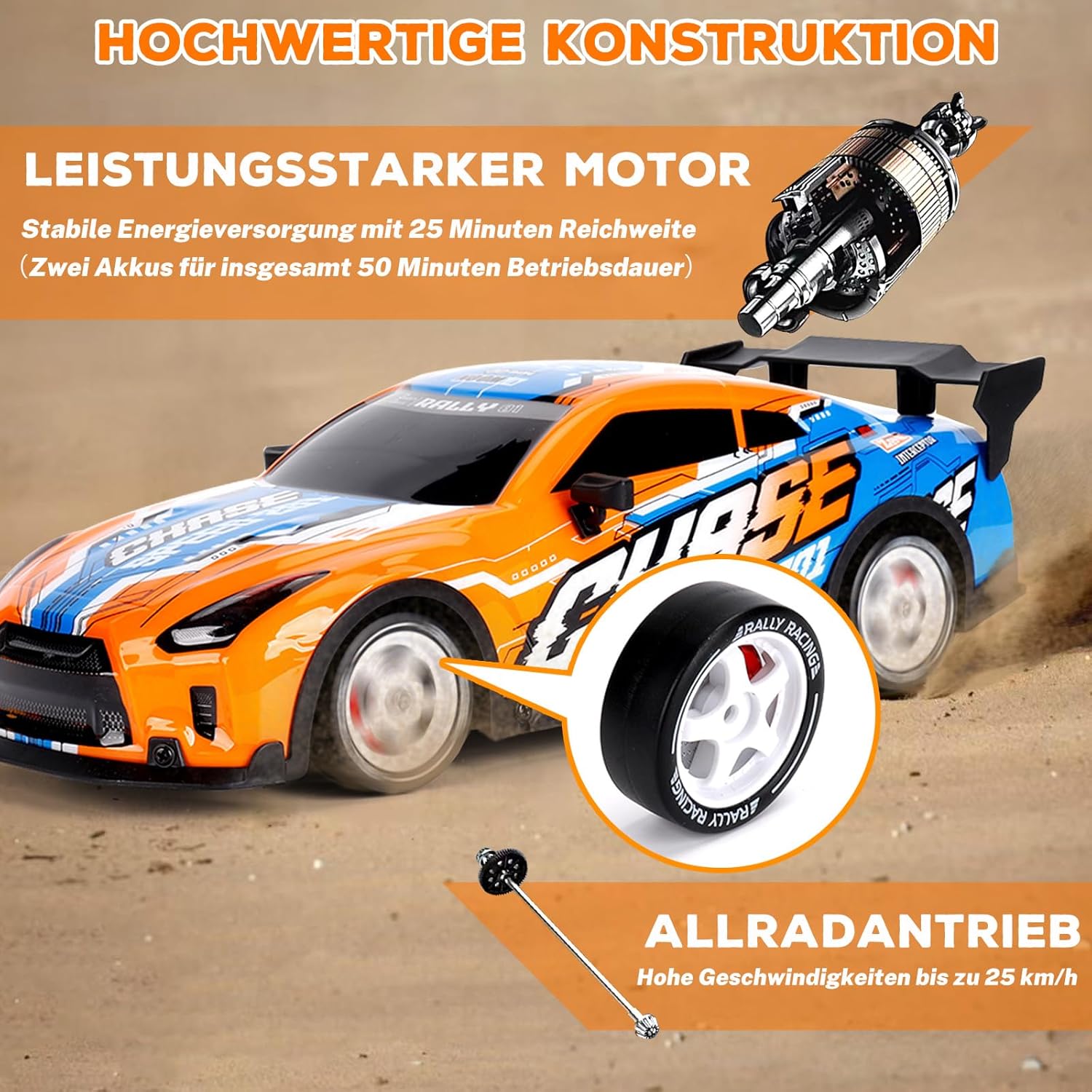 - đăVier-Rad-AntriebssystemăDieses RC drift auto hat ein 4WD Antriebssystem und kann Geschwindigkeiten von bis zu 25km/h erreichen, wobei die Lenkung ĂŒber die VorderrĂ€der gesteuert wird. Das RC auto ist mit 4 Rennreifen und 4 Driftreifen