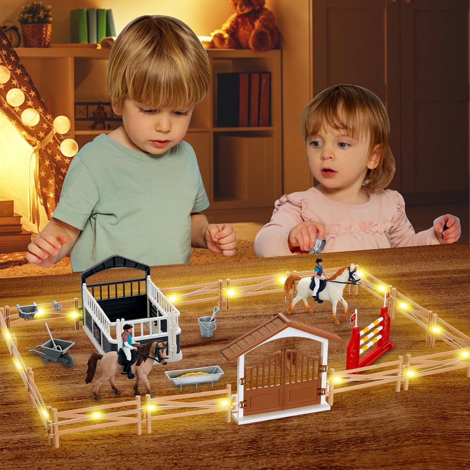 - 49STK Reiterhof Pferdeclub: Unser Paket beinhaltet 14*Zaunelemente, 2*Pferde mit Reiter, 2*Pferderennbahn, 1*Korb, 1*Wagen, 1*Eimer, 1*Spaten, 1*Eingangstor, 1*Pferdestall, 1*Futterkrippe, 1*Wasserkelle, 1*Gartengabel, 1*LED Lichterkette,