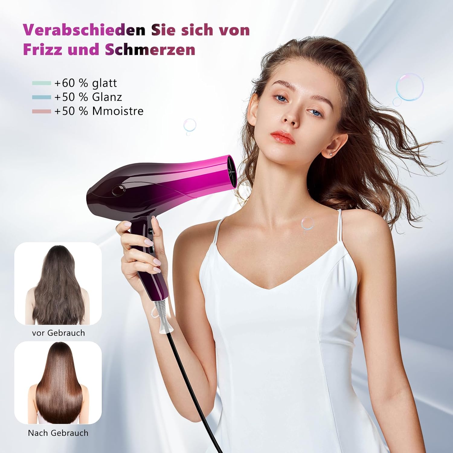 - 【Super Haarpflege】:Der Haartrockner überhitzt nicht, der Haartrockner mit Diffusor schützt die Kopfhaut und das Haar effektiv vor Schäden bei einer gesünderen Temperatur, schützt das Haarprotein, spendet dem Haar Feuchtigkeit, reduziert Frizz,