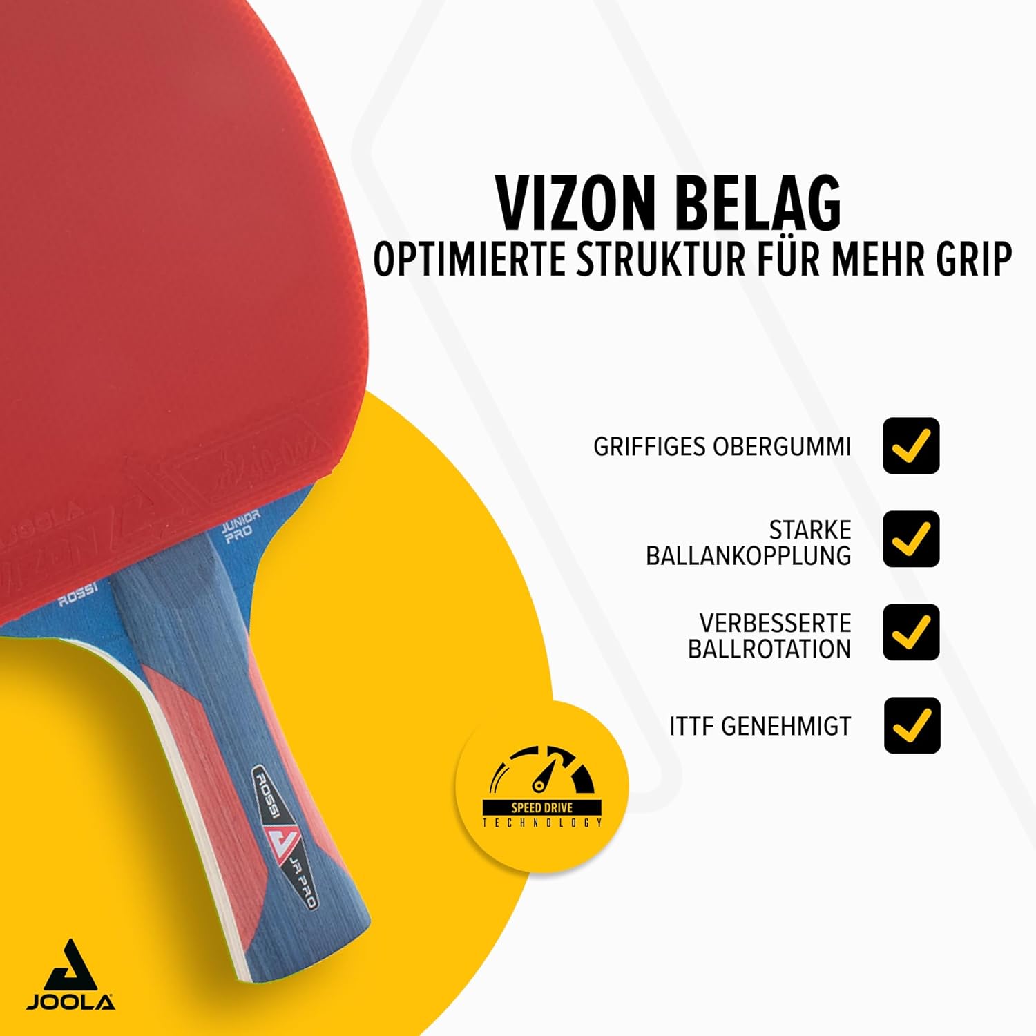 - PROFI JUNIOR TISCHTENNISSCHLÄGER: Die ITTF genehmigten JOOLA Vizon Beläge haben eine hohe Eigendynamik, um offensive Akzente mit viel Rotation zu setzen