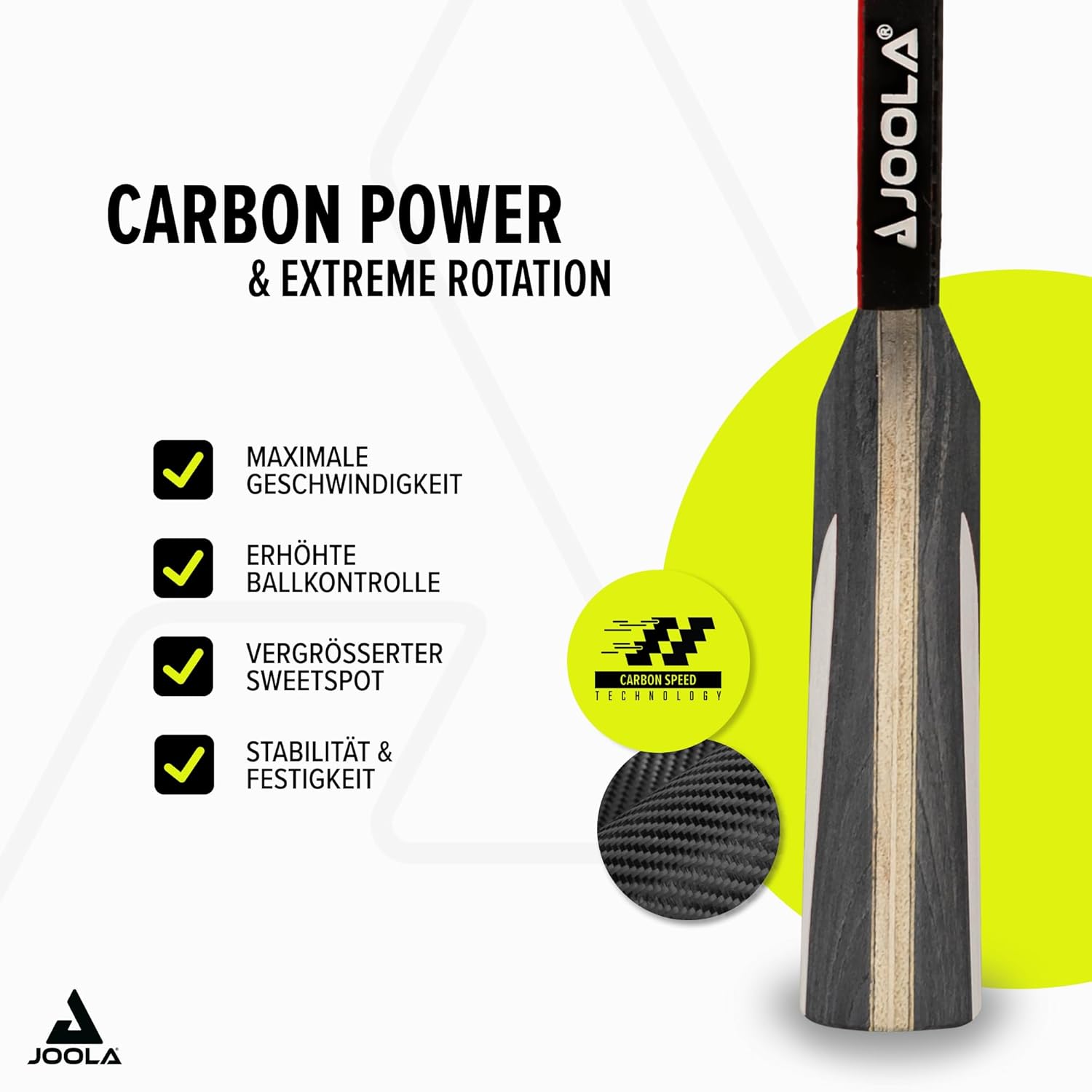 • Das über die Jahre erworbene Wissen in der Herstellung von Tischtennis Produkten ist die Grundlage für die Produktion des JOOLA Carbon X PRO Tischtennisschlägers. JOOLA steht seit Jahrzenten für Tischtennis Qualität, Kompetenz und Tradition