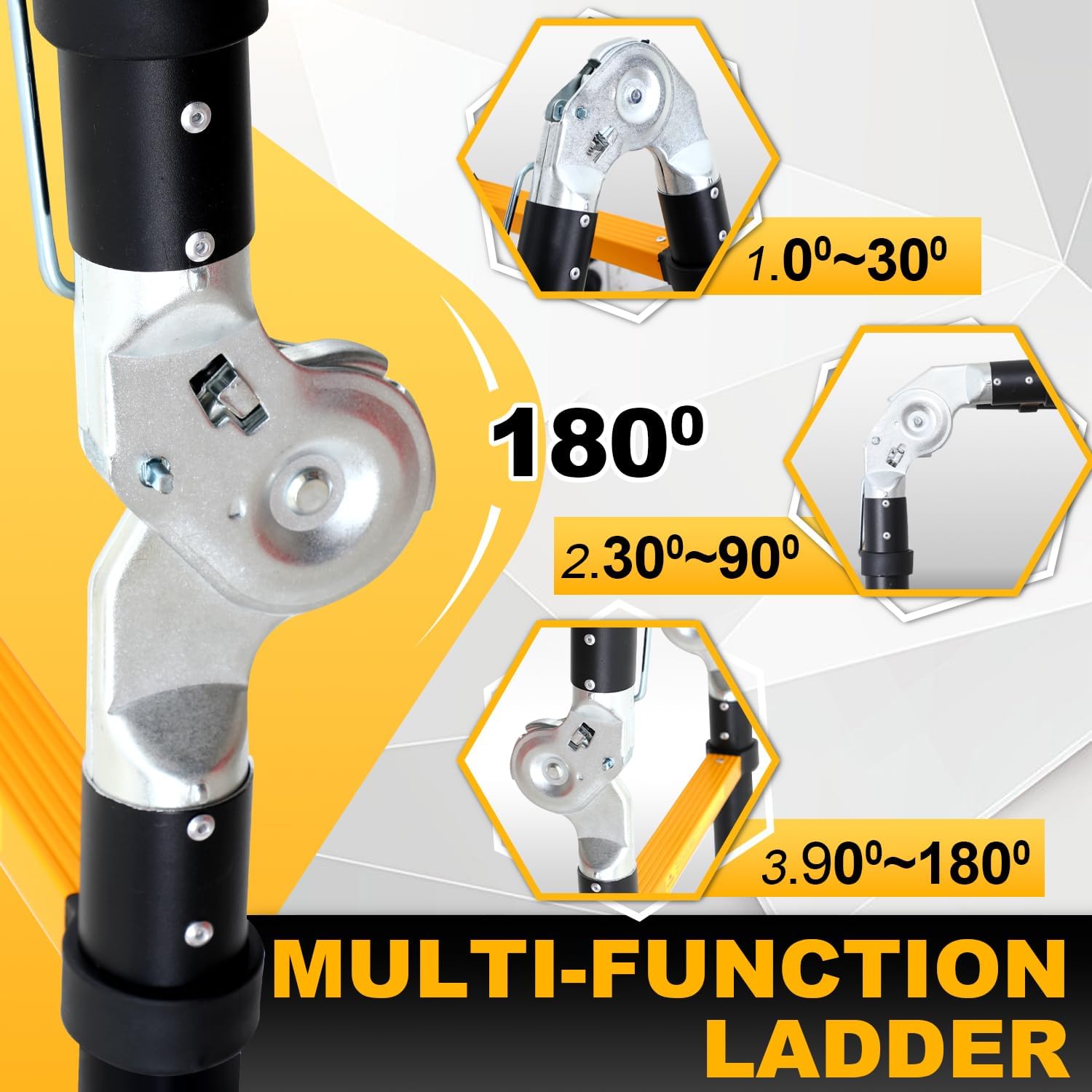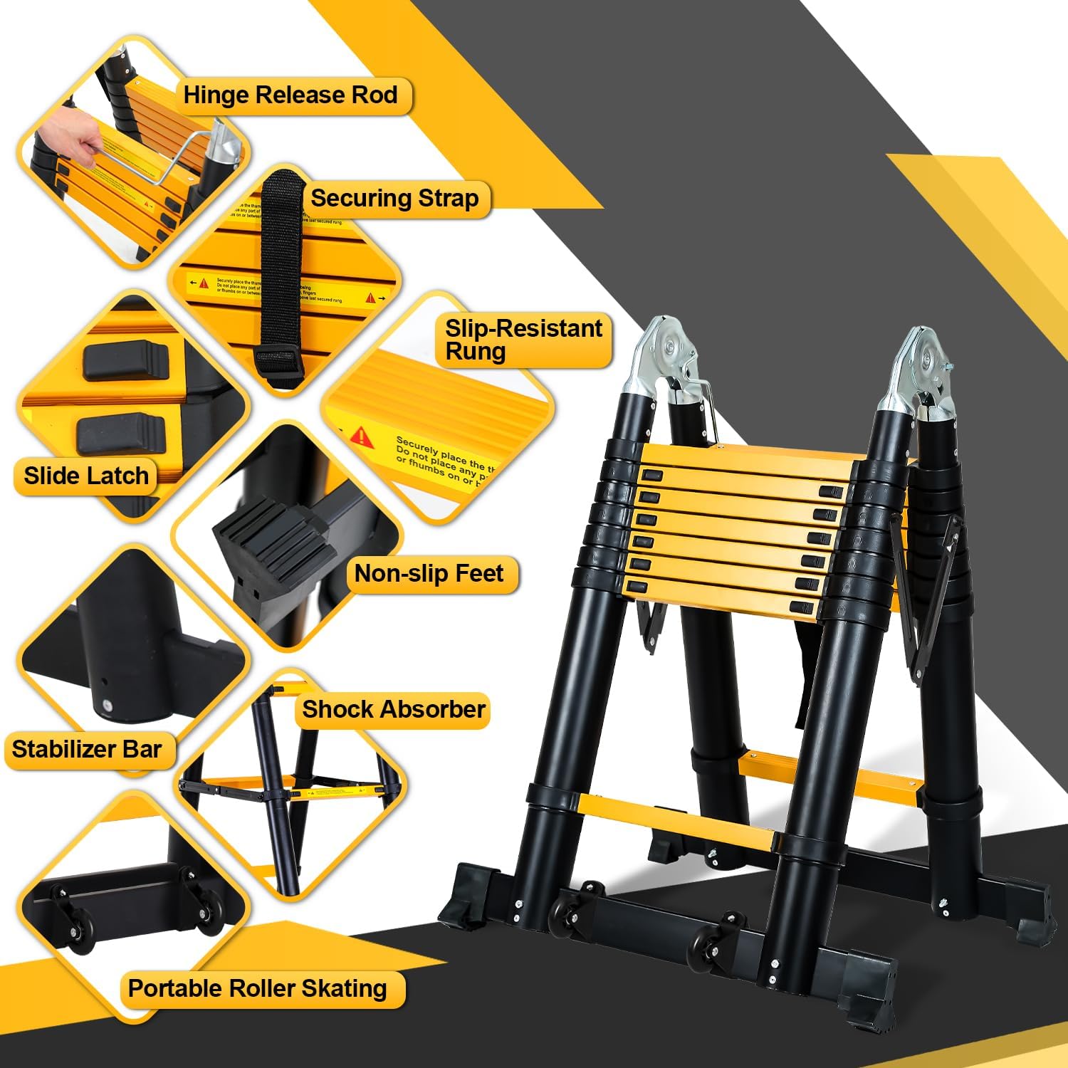 - 🧗Klappbare Teleskopleiter: Die Leiter nimmt ein Klappdesign mit einer Höhe von 3.8(1.9+1.9) Metern und insgesamt 6+6 Stufen an. Bei jedem Schritt wird der Sicherungsstift automatisch gesperrt, sodass die Leiterhöhe nach Bedarf angepasst werden kann.