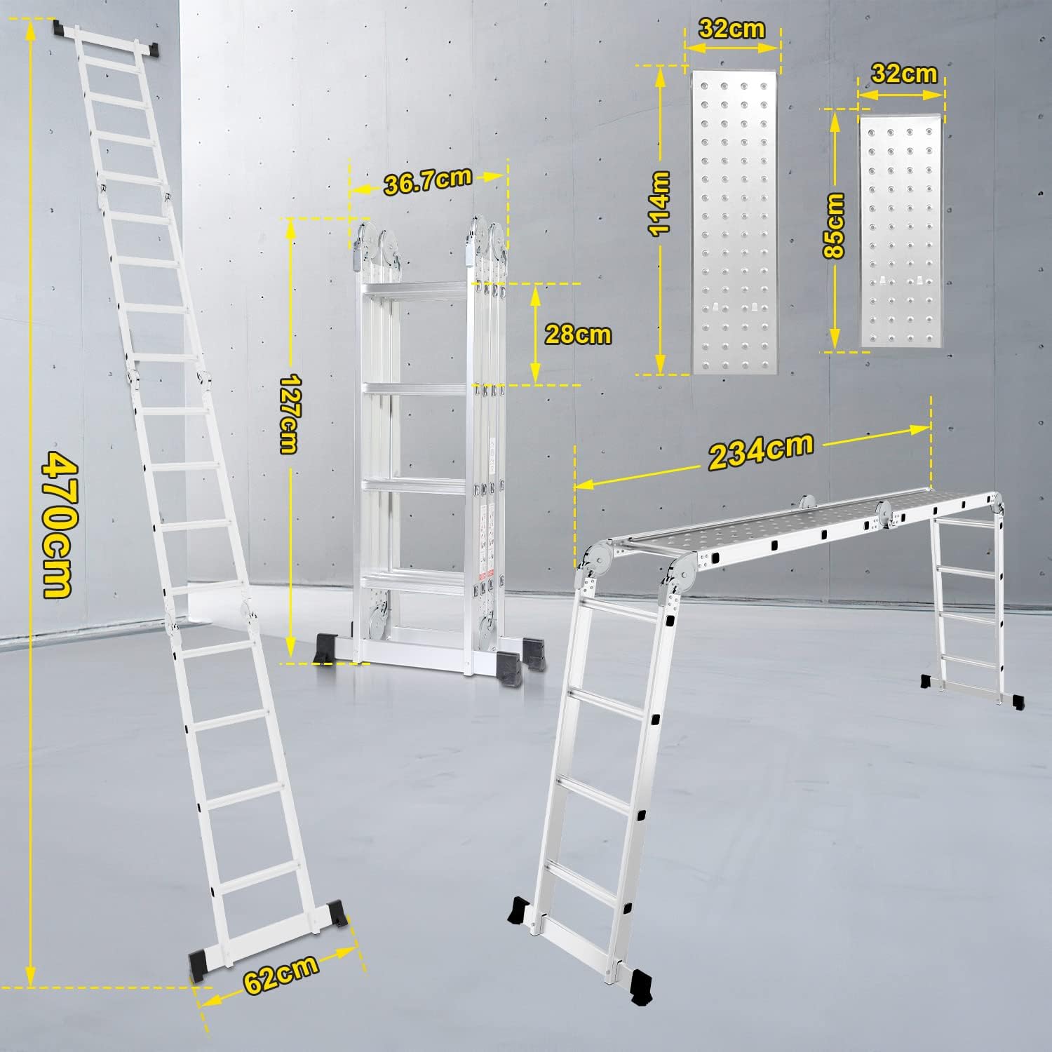 - đ„470cm Mehrzweckleiter mit 2 Plattformplatten, flexible Leiter fĂŒr Arbeiten auf Treppen oder unebenen OberflĂ€chen.
