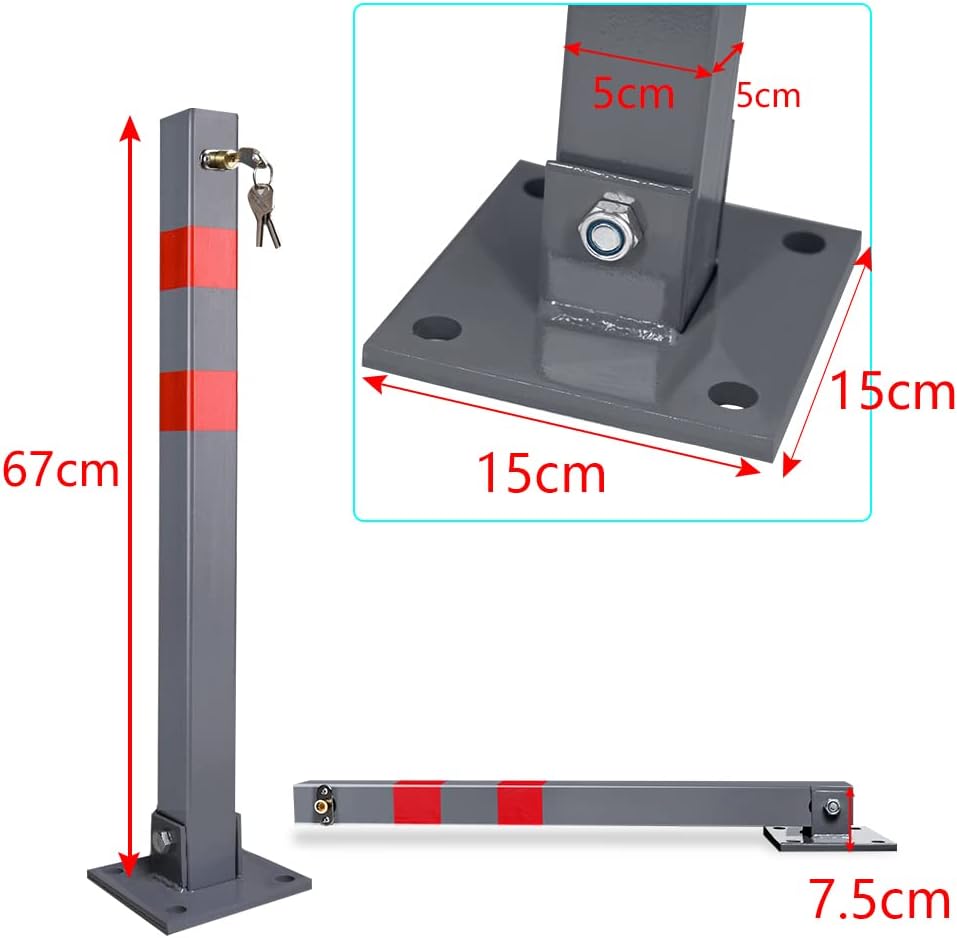 - 【Passende Grösse】Diese Parkpfosten-Grösse ist 5*5*67cm, Bodenplattengrösse ist 15*15cm, Rohrinnendurchmesser: 4cm, Höhe im zusammengeklappten Zustand beträgt nur 7,5cm, grundsätzlich für alle Fahrzeuge anwendbar.