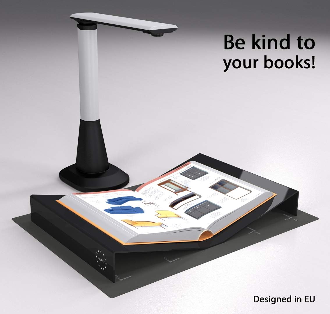 - Die schwarze Oberfläche eignet sich perfekt als Kontrastvorlage. Die Buchscannersoftware kann so beim Zuschneiden der gescannten Seiten optimale Ergebnisse automatisch liefern. Die Buchwiege bietet perfekten Stand für Vorlagen mit der Scanfläche bis