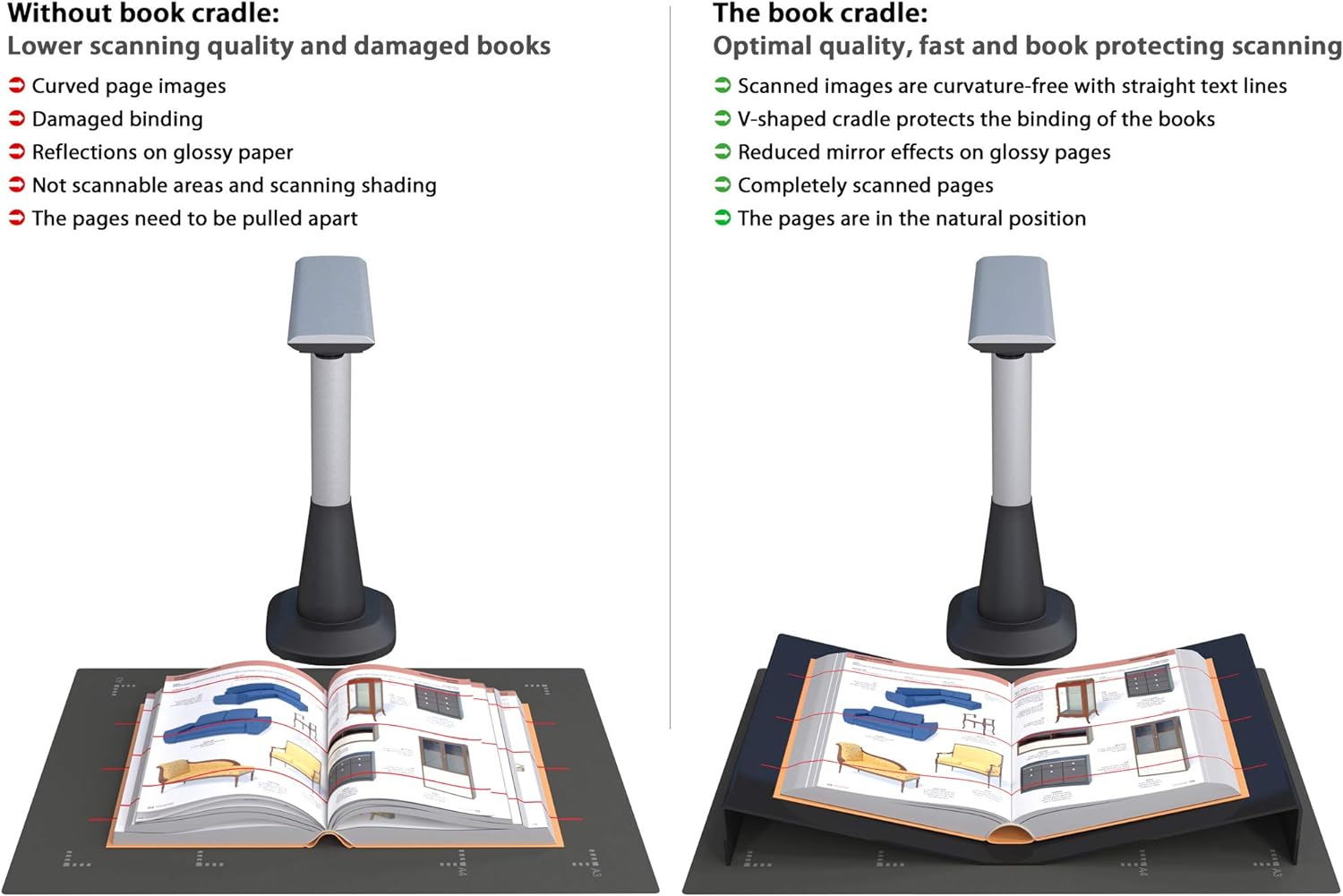 - Der ausgewählte Winkel sorgt dafür, dass die Bücher optimal liegen und die zu scannende Seite nicht in der Lage verändert wird. Anders als ohne Buchwiege werden die Seiten nicht gewellt. Aufgeschlagene Bücher werden besser vom Scanner erfasst, weil