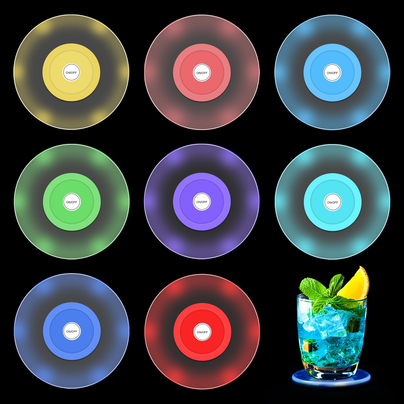 - 【LED Untersetzer Set】8 Bunt LED Untersetzer mit 10 cm Durchmesser. Halten Sie die Ein-/Aus-Taste eine Sekunde lang gedrückt, um die LED-Leuchten einfach zu aktivieren, sodass Sie Ihre Eisgetränke zum Leuchten bringen können ein Blitz. Cocktail