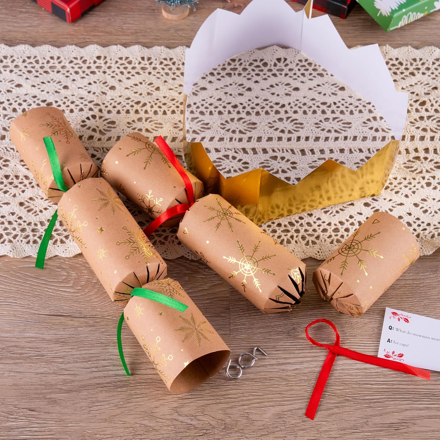 - Weihnachts-Partygeschenke ohne Druckknopf: Unser Partygeschenkset für die Feiertage enthält 12 Packungen mit Weihnachts-Partygeschenken mit 4 Schneeflocken-Designs aus Kraftpapier. Jedes Partygeschenk enthält eine Krone aus Papier, ein