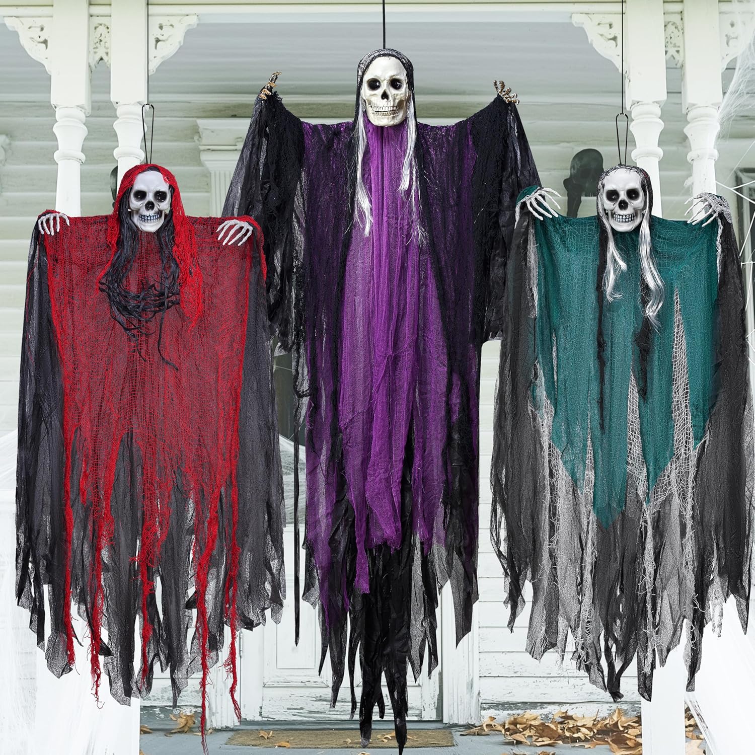 - Gruseliger Look: Diese Sensenmänner sehen mit ihren wallenden Roben und ihren gruseligen Totenkopfköpfen, weissen Haaren und Händen gruselig aus. Bereiten Sie die Bühne für eine gruselige Halloween-Party mit unseren hängenden