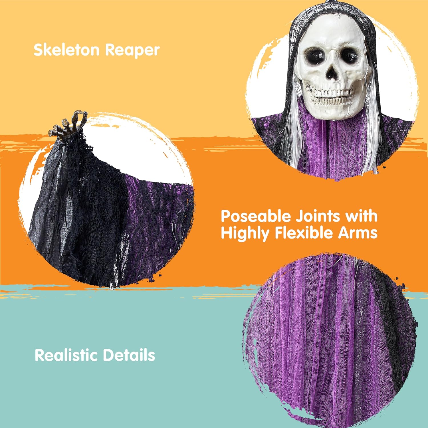 - Verstellbare Arme: Schaffen Sie einen gruseligen Faktor mit unseren verstellbaren Grim Reaper-Armen! Egal, ob Sie Ihre Gäste mit einer unheimlichen Pose erschrecken oder sie mit einem anderen Winken begrüssen möchten, mit den verstellbaren Armen