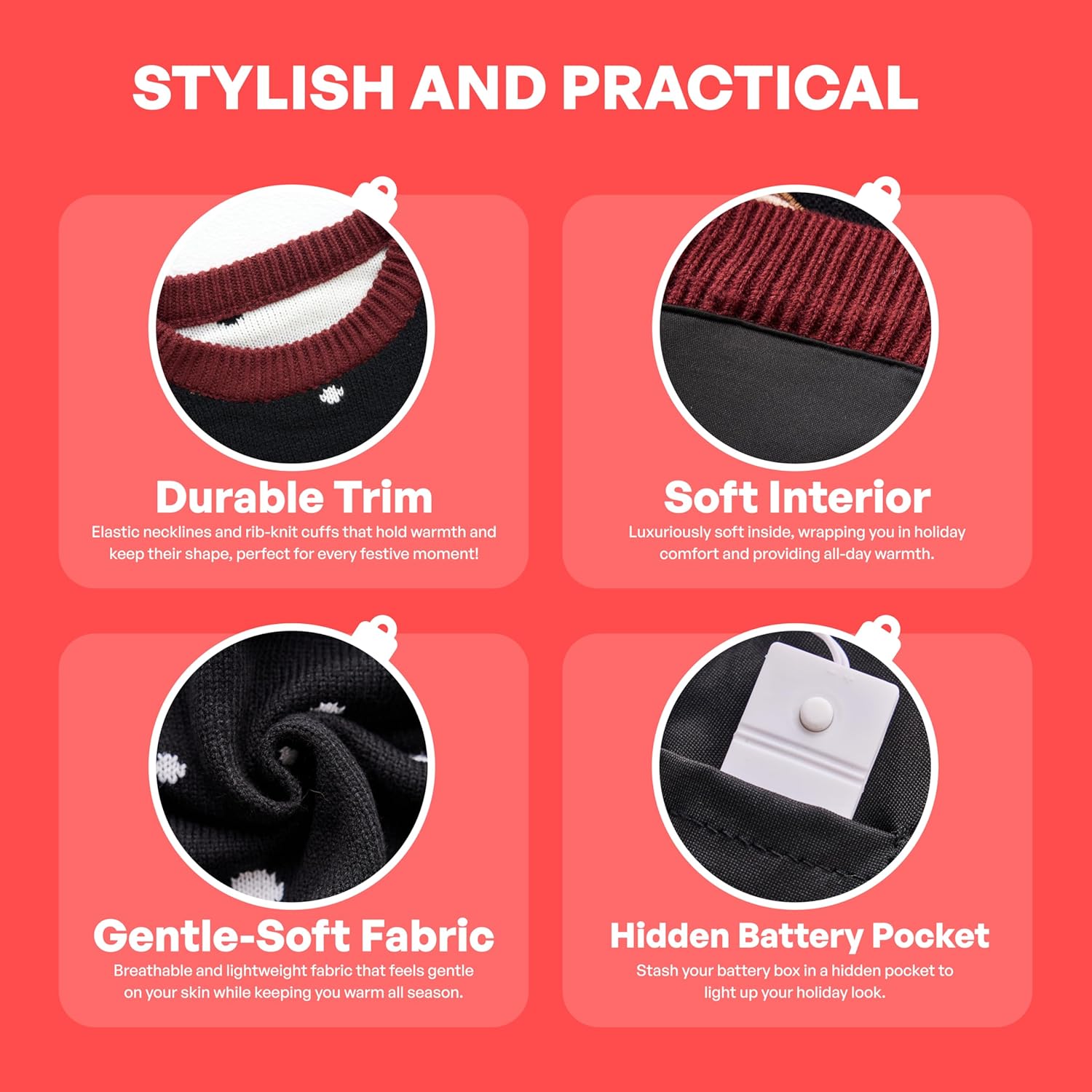 - EINZIGARTIG UND FESTLICH. Dieser hässliche Weihnachtspulli wird bei Ihrer nächsten Weihnachtsfeier garantiert für Aufsehen sorgen. Mit blinkenden Lichtern an den Ornamenten. Dieses knallige Meisterwerk wird mit Sicherheit ein paar Lacher bei Ihren