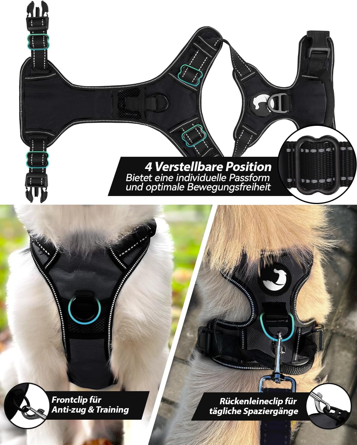 - Einfaches Anlegen und Abnehmen: Dieses Geschirr verfügt über einen Schnappverschluss für Körper und Hals, sodass es viel einfacher ist, es anzulegen und abzunehmen. Der Kopf des Hundes muss nicht in das Geschirr gezwängt werden, auch die Ohren