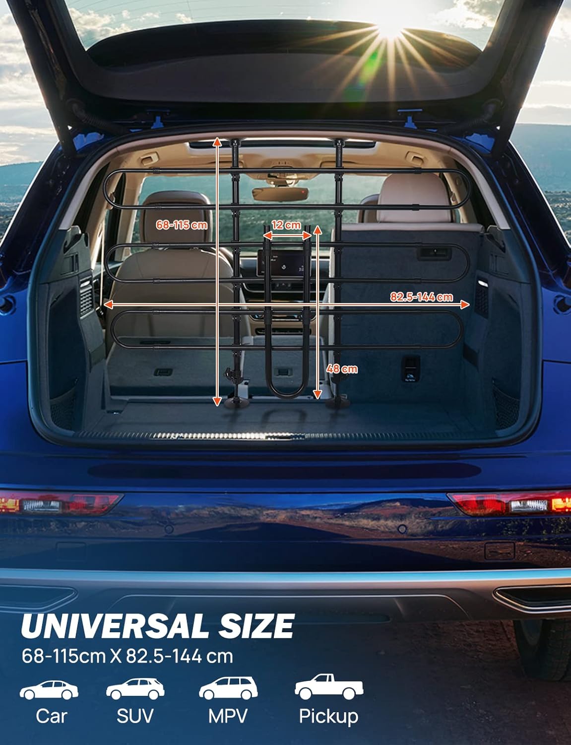 • 🚗UNIVERSAL FÜR DIE MEISTEN AUTOS: Minimale / maximale Breite:82.5-144cm, Höhe: 68-115cm. Die Breite und Höhe der Hundegitter lässt sich leicht verstellen. Sie können sich an die Breite des Kofferraums anpassen.
