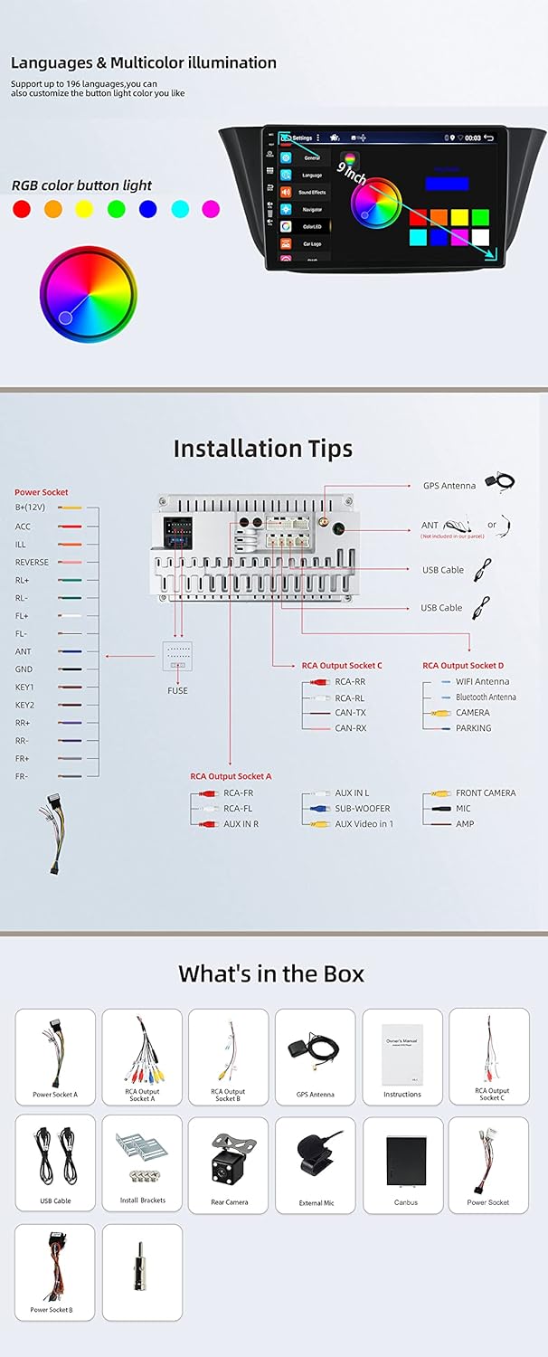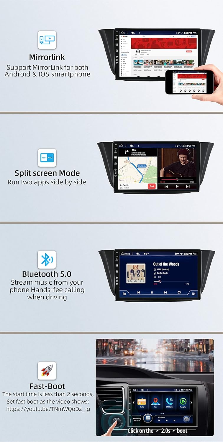 PRODUKTBESCHREIBUNGEN Informationen über das System Verwenden des Betriebssystems Android 12 CPU: Rockchip AC8257 A53 Prozessor | 8 Core RAM: DDR3 6 GB ROM: 128 GB. Bluetooth: BT 5.0. Eingebauter Dimmer: Ja Audioausgang: 4 x 50 W max. FM: 87,5 MHz ~ 108 MHz. AM: 522 KHz ~ 1620 KHZ Dateikompatibilität: JPEG, MP3, MP4, AVI, WAV und andere Lenkrad-Steuerung Lenkradsteuerung Ändern Sie die Spur, die Lautstärke und andere Funktionen bequem DAB+ Digitalradio (unterstützt, DAB-Box + obligatorisch) Sound in der Audio-CD nah an Qualität und rauschfreie Übertragung DAB-Radio ein besonderes Erlebnis im Fahrzeug. Kamera-Eingang (KOSTENLOSE Rückfahrkamera) Unterstützt Rückfahrkamera Es schaltet automatisch zur Rückfahrkamera um, wenn der Rückwärtsgang eingelegt wird. Mirror Link Ermöglicht es Benutzern, über USB / WiFi zu übertragen, was auf dem Telefon angezeigt wird. Alle Inhalte von Android- oder iOS-Smartphones können auf Bxliyer-Stereos abgespielt werden. OBD2 (unterstützt) Echtzeitdaten und Fehlercodes vom Fahrzeugcomputer, Kompatible App: Paar kompatibel: die meisten OBD2 und WiFi OBD2 Scanner