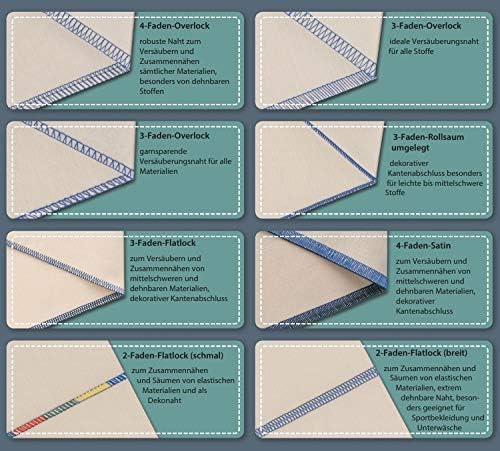 - Lieferumfang: Blindstichfuss, Nadelset, Schraubendreher, Nadelschraubendreher, Pinzette, Garnteller, Konenhalter, Garnnetze, Öler, Reinigungspinsel, Bedienungsanleitung, Fussanlasser, Weichhaube, Abfallbehälter