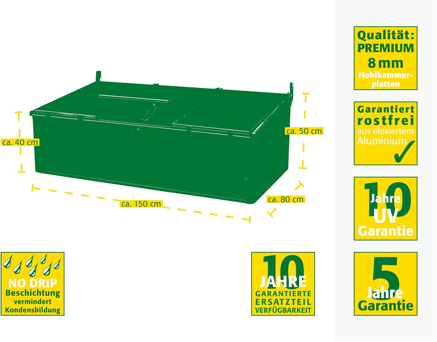 - Stabile Konstruktion: Dieses Frühbeet ist durch 8 mm Thermohohlkammerplatten und den starken Alurahmen sehr stabil und bedienungsfreundlich