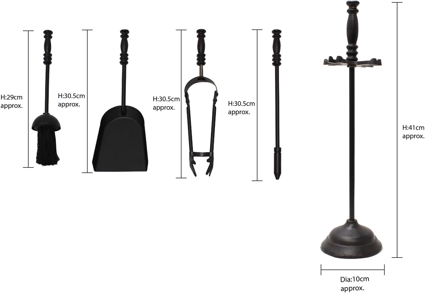 • Enthält Schaufel, Bürste, Schürhaken, Zange und Ständer