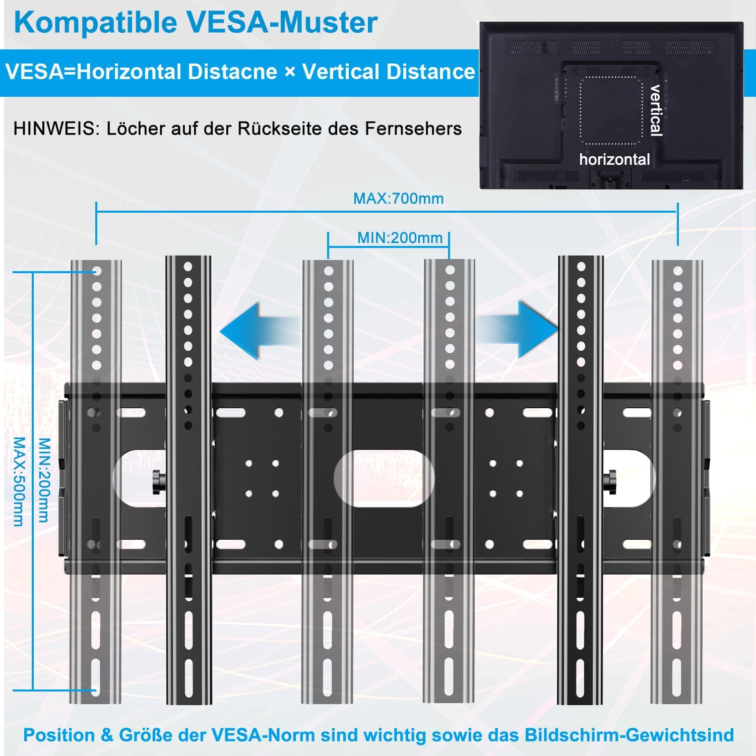 - 𝗨𝗡𝗧𝗘𝗥𝗦𝗧Ü𝗧𝗭𝗧𝗘 𝗩𝗘𝗦𝗔-𝗡𝗢𝗥𝗠𝗘𝗡: Kompatible VESA-Löcher - 200x200, 300x200, 300x300, 400x200, 400x300, 400x400, 500x200, 500x300, 500x400, 500x500, 600x200, 600x300, 600x400, 600x500, 700x400,