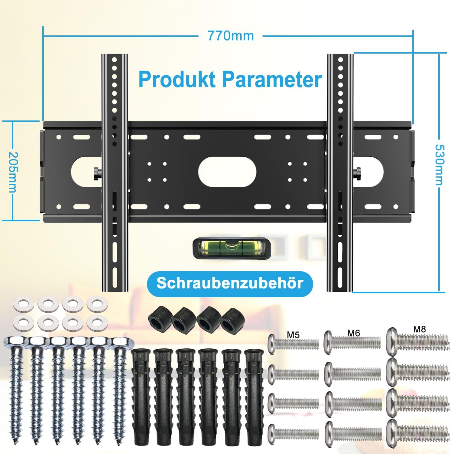 - 𝗙𝗨𝗡𝗞𝗧𝗜𝗢𝗡𝗘𝗡: Der Neigebereich der Fernseher Aufhängung ist +/-15 Grad. Diese Fernseherhalterung ist mit einem Wandabstand von 65mm ultra slim und nah an der Wand, Platzsparend und ordentlich. Dieser Wandhalter ist NICHT