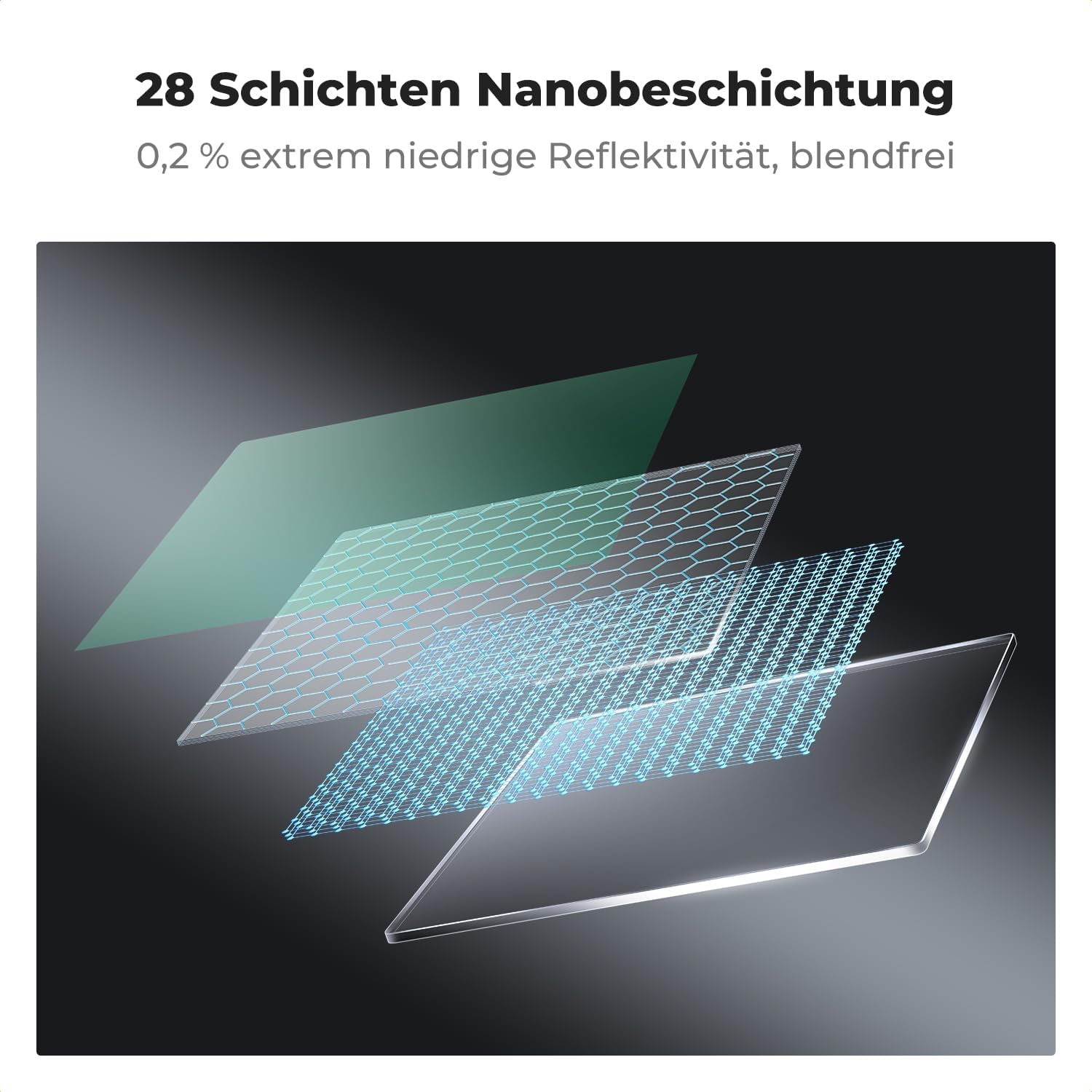 - NANO-BESCHICHTUNG: Hochwertiges japanisches AGC-Glas mit 28-lagiger Nano-Beschichtung, sorgt für neutrale Farbbalance, reduziert die Linsenreflexion und entfernt Geisterbilder.