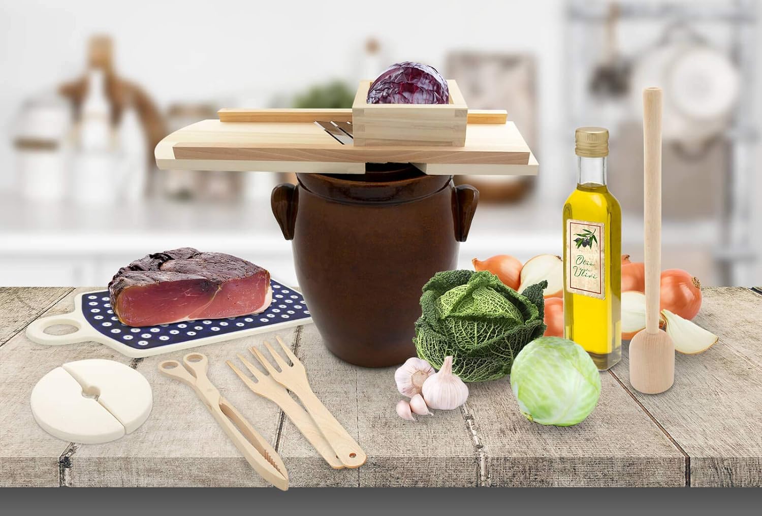 • in Kombination mit dem K&K Gärtopf (Artikelnummer: 233103036), K&K Krautstampfer (Artikelnummer: 233301000), der K&K Krautzange Typ Schere (Artikelnummer: 233501000), der K&K Krautzange Typ Classic (Artikelnummer: 233601000) und der K&K Krautgabel