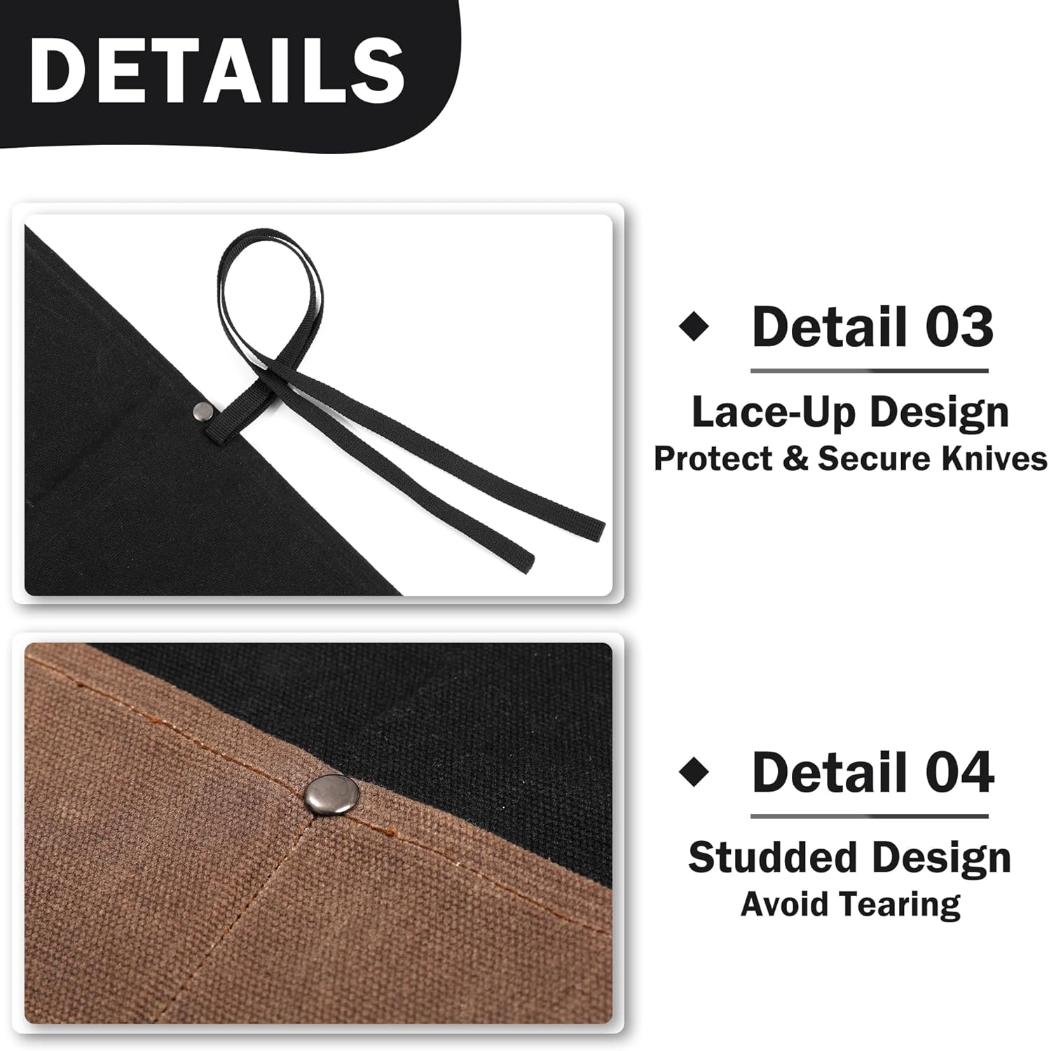 - CUT-PROOF: Das Futter ist aus professionellem schnittfestem Stoff gefertigt, um Ihre Messer und Messerrolle vor Beschädigungen zu schützen.