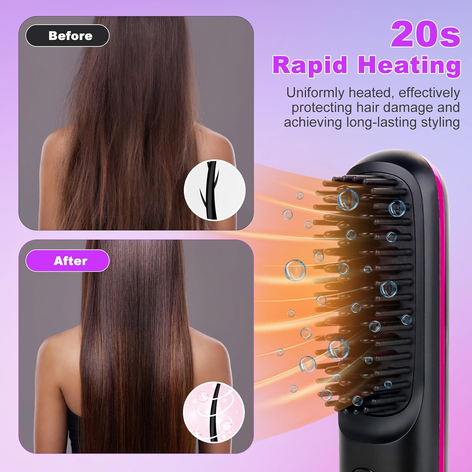 - 【Reduziert Frizz Und Schützt Sicher】Der neue und verbesserte kabellose Glättungskamm ist mit zwei Kammzähnen ausgestattet. Die innere Schicht des Verbrühschutzkamms verhindert Verbrennungen der Kopfhaut, während die äussere Schicht des dichten