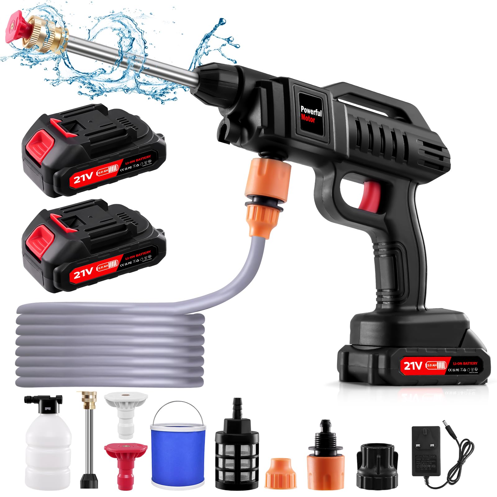 - 🔋【Zwei Akkus für langanhaltende Power】Ausgestattet mit zwei 21V 2000mAh Akkus ermöglicht die Waschpistole bis zu 30 Minuten Reinigung. Inklusive Schaumsprühkanne für cremigen Schaum, der Verschmutzungen effizient löst – perfekt für die