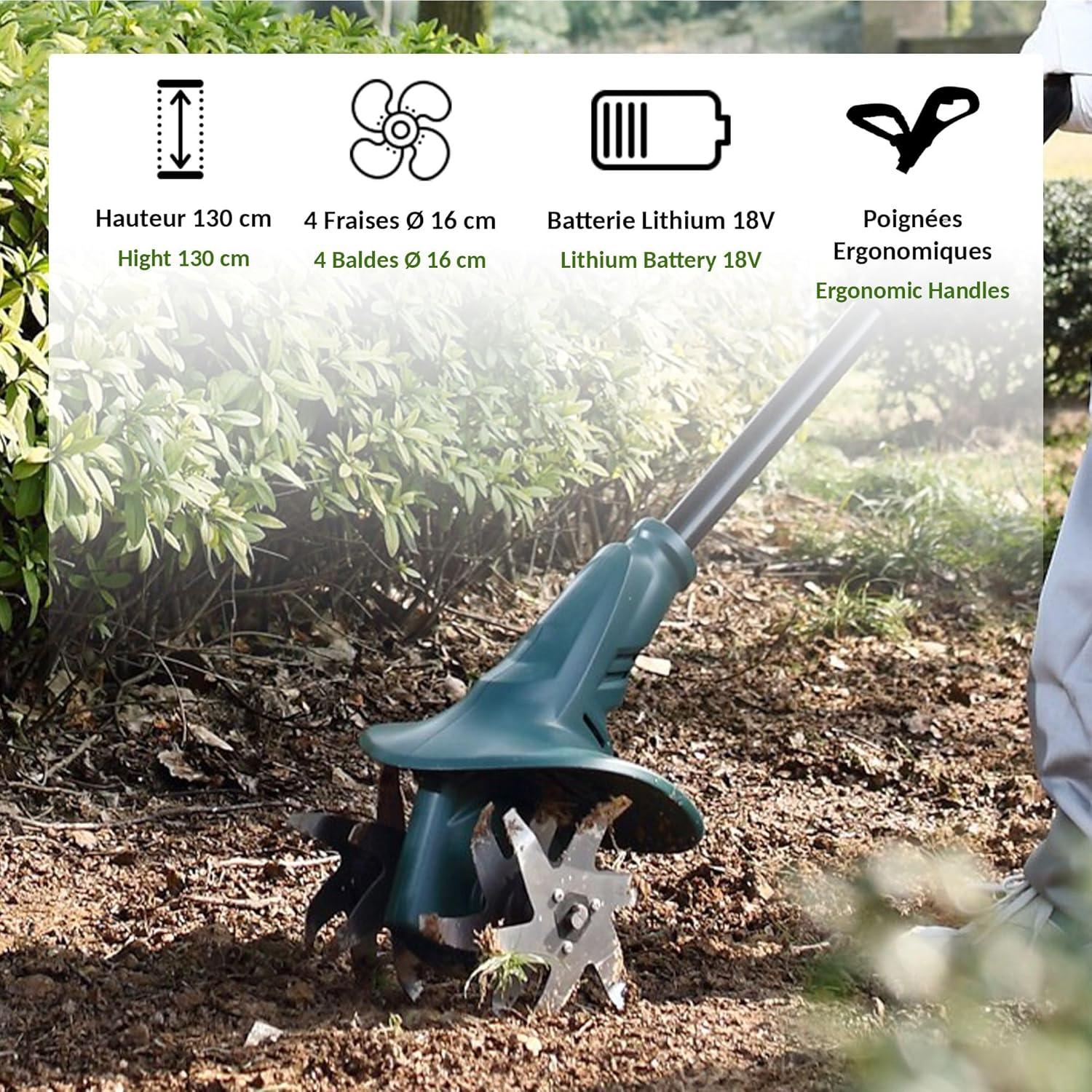 - 🌿 - ELEKTRISCH & KABELLOS - Die kabellose elektrische Motorhacke folgt Ihnen überall hin, ohne Sie zu belasten. Ideal für den Einsatz im Gewächshaus. Sie funktioniert mit einem wiederaufladbaren Lithium-Akku für eine Arbeitsdauer von ca. 35