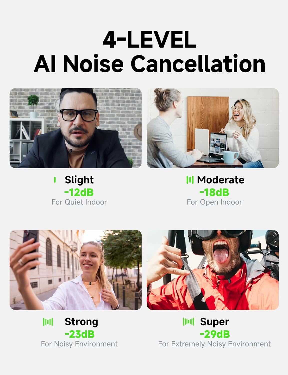 - 4‑stufige KI‑Rauschunterdrückung: Mit intelligenter Geräuschunterdrückung, 32dB Gain‑Control und automatischem Limiter liefert das kabellose Mikrofon klaren Ton; mit einem Knopfdruck lassen sich die vier Stufen leicht durchschalten. Filtert