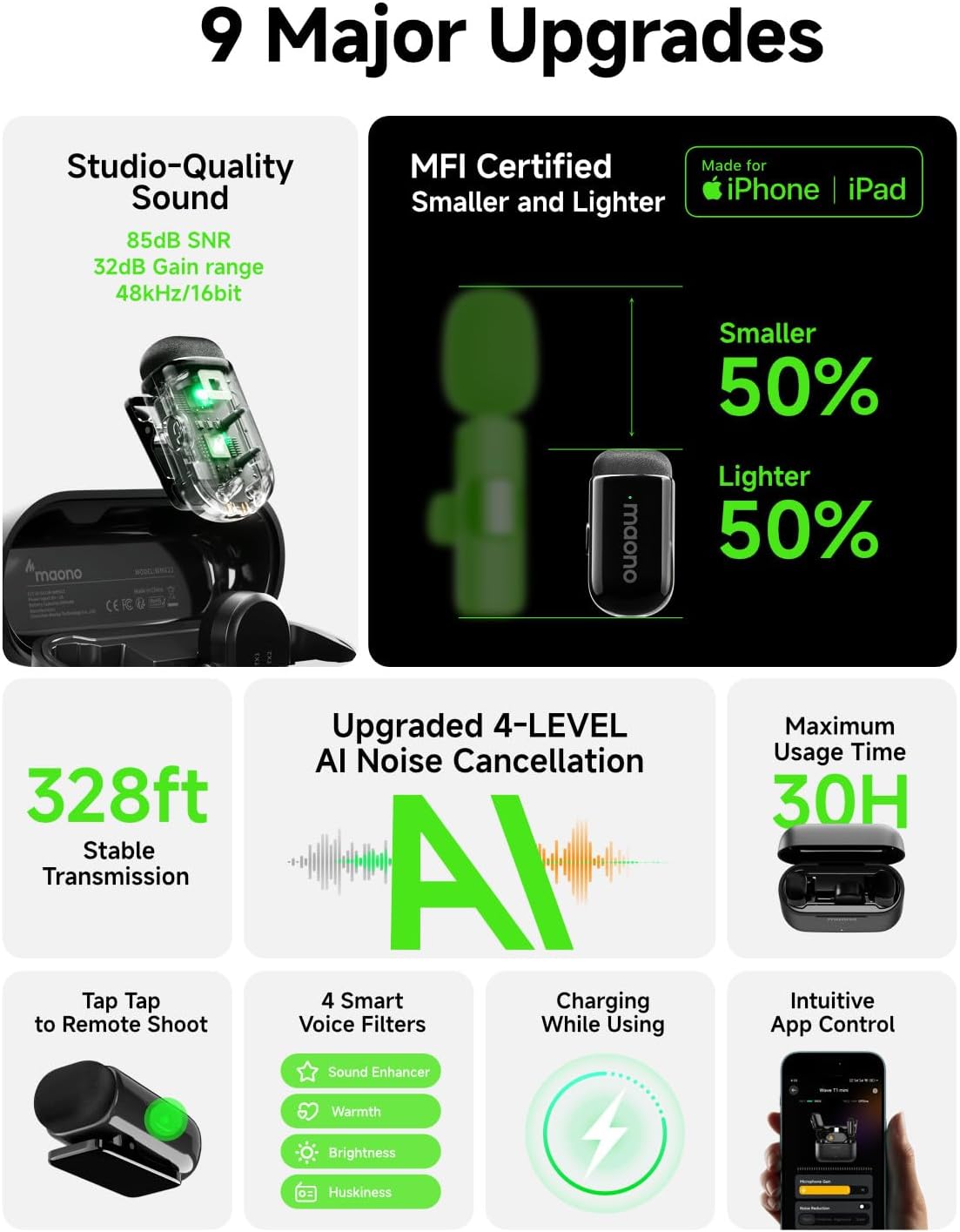 - 100 m Reichweite & kreative Features: Plug-and-play mit stabiler Verbindung bis 328ft (100 m). Doppeltippen zum Starten von Aufnahmen. Über die Maono Link App wählst du Voice Filter & Effekte – für kreative, massgeschneiderte Audioaufnahmen.