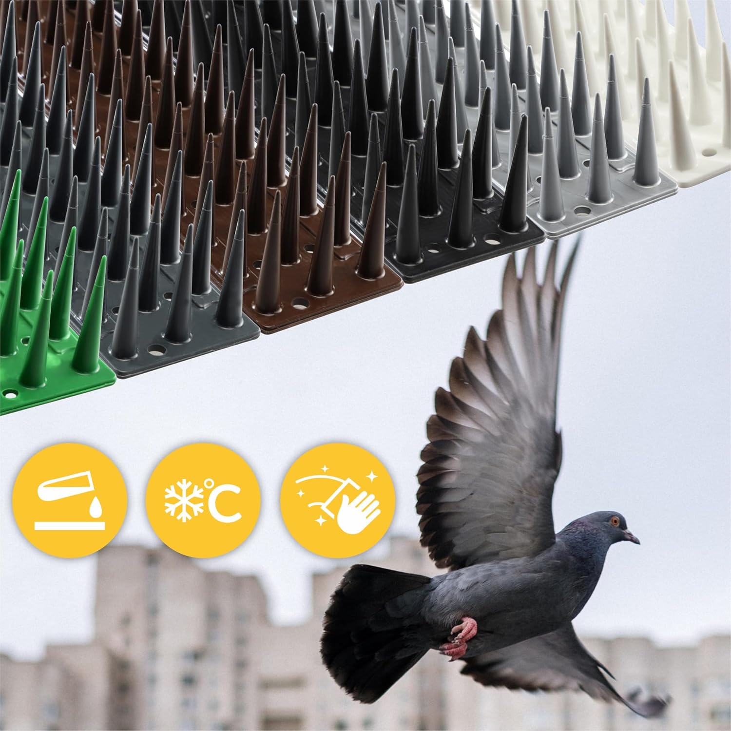 - DIE SPIKES AUS PLASTIK VERHINDERN WIRKSAM DAS LANDEN UND HERUMSITZEN VON TAUBEN ODER SPECHTEN auf solchen Stellen wie Fensterbänken, Balustraden, Dachkanten, Blechelementen, Gesimsen, Kassettendecken, Klimaanlagen oder kleinen Dächern. Das Produkt