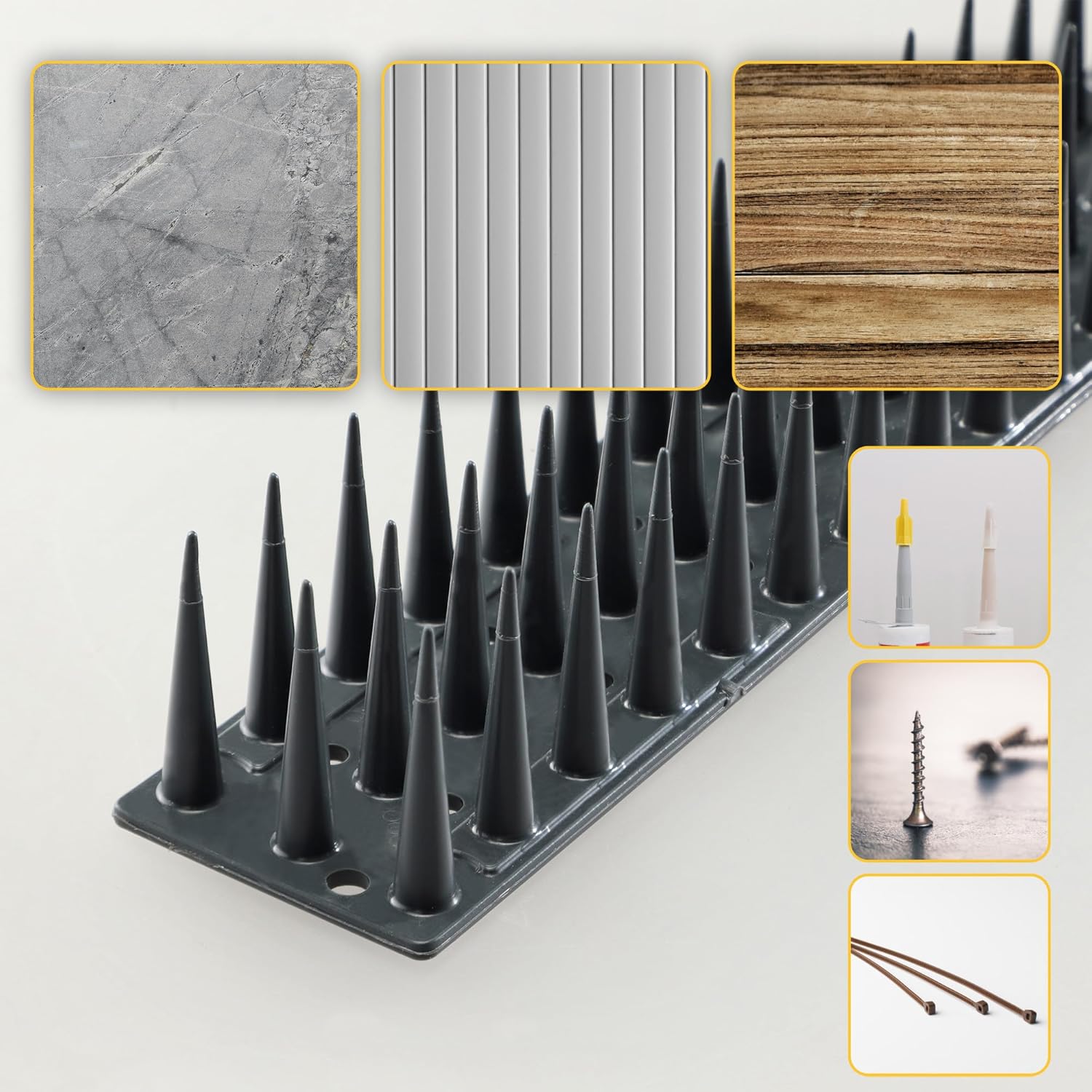- DER GEGENSTAND LÄSST SICH EINFACH MONTIEREN, Z. B. MIT DEM KLEBSTOFF, DEN DÜBELN ODER KABELBINDERN. Die Spikes verhindern, dass die Vögel auf Fensterbänke, Dächer, Treppen oder Geländer gelangen und schützen so die Flächen vor Vogelkot oder