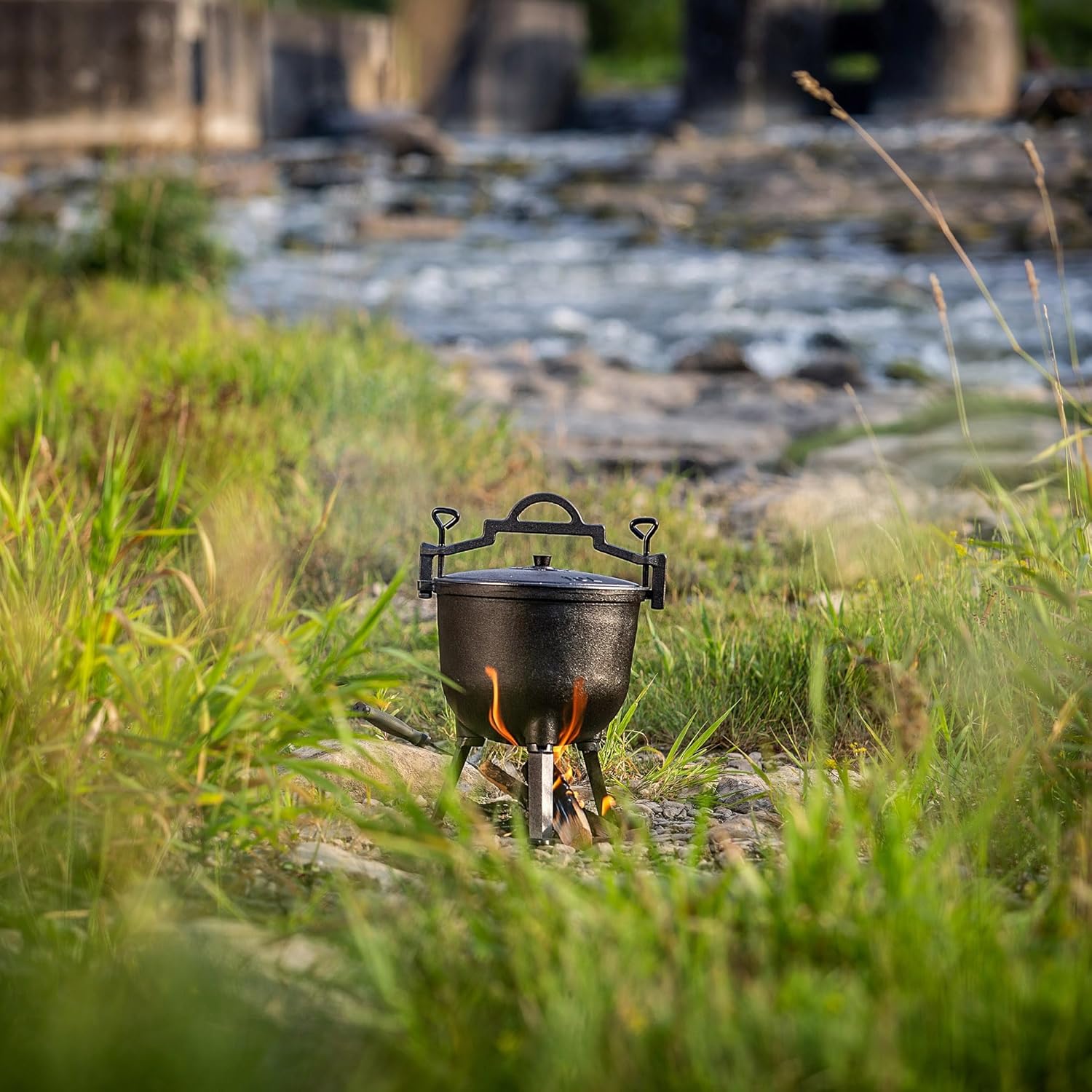 - Stabil: ein grosser Vorteil des Schmortopfes aus Gusseisen sind drei Füsse, die eine stabile Konstruktion garantieren. Sie sorgen für das sichere Platzieren des Topfes über dem Lagerfeuer. Je nach Bedarf können Sie sie auch abnehmen.