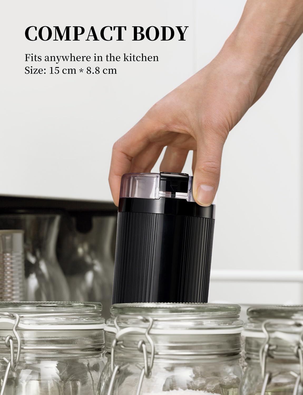 • [Schnelles und gleichmässiges Mahlen]: Coffee grinder mit hochwertigen 304 Edelstahlklingen und der hohen Geschwindigkeit von 38000 U/min starken Motor sorgen für schnelles und gleichmässiges Mahlen, und besser, um das ursprüngliche reiche Aroma und