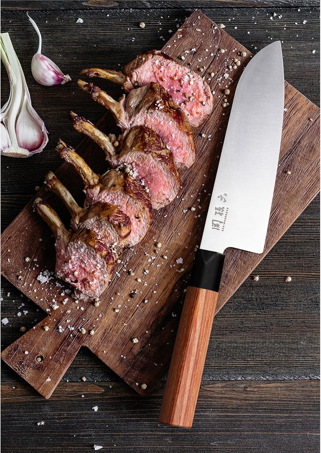 • Das traditionelle Santoku ist das beliebteste Messer in Japan, wörtlich übersetzt bedeutet "San-Toku": „Drei Tugenden“, hier ist Gemüse, Fisch und Fleisch gemeint
